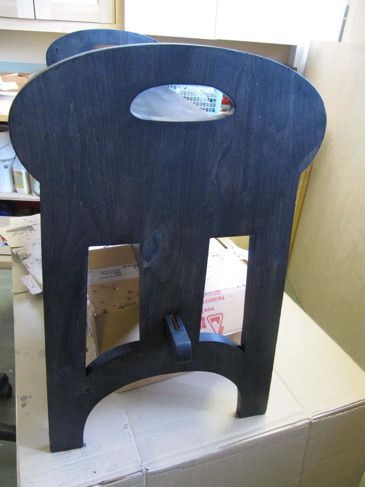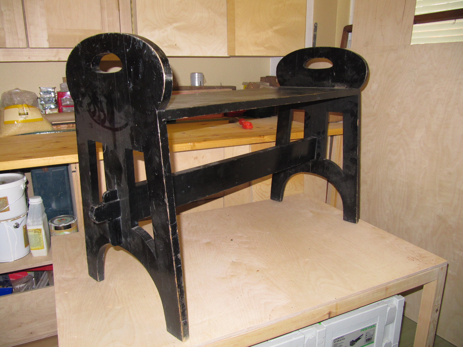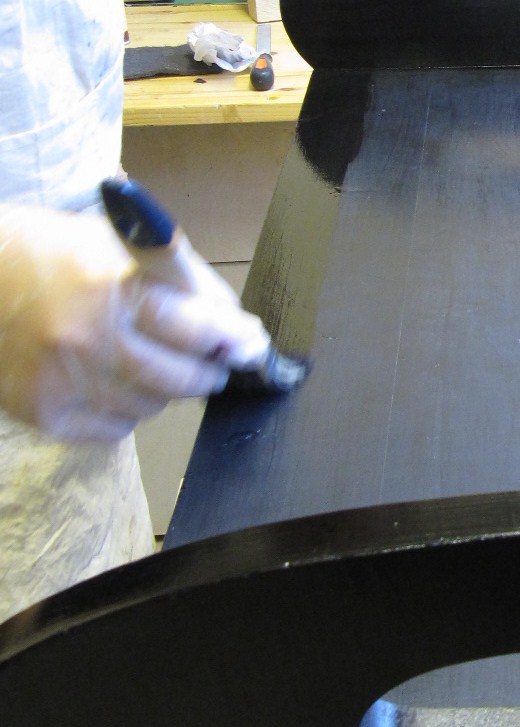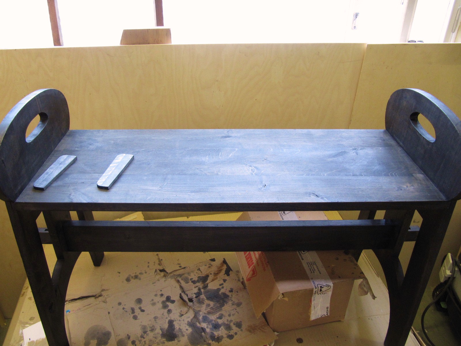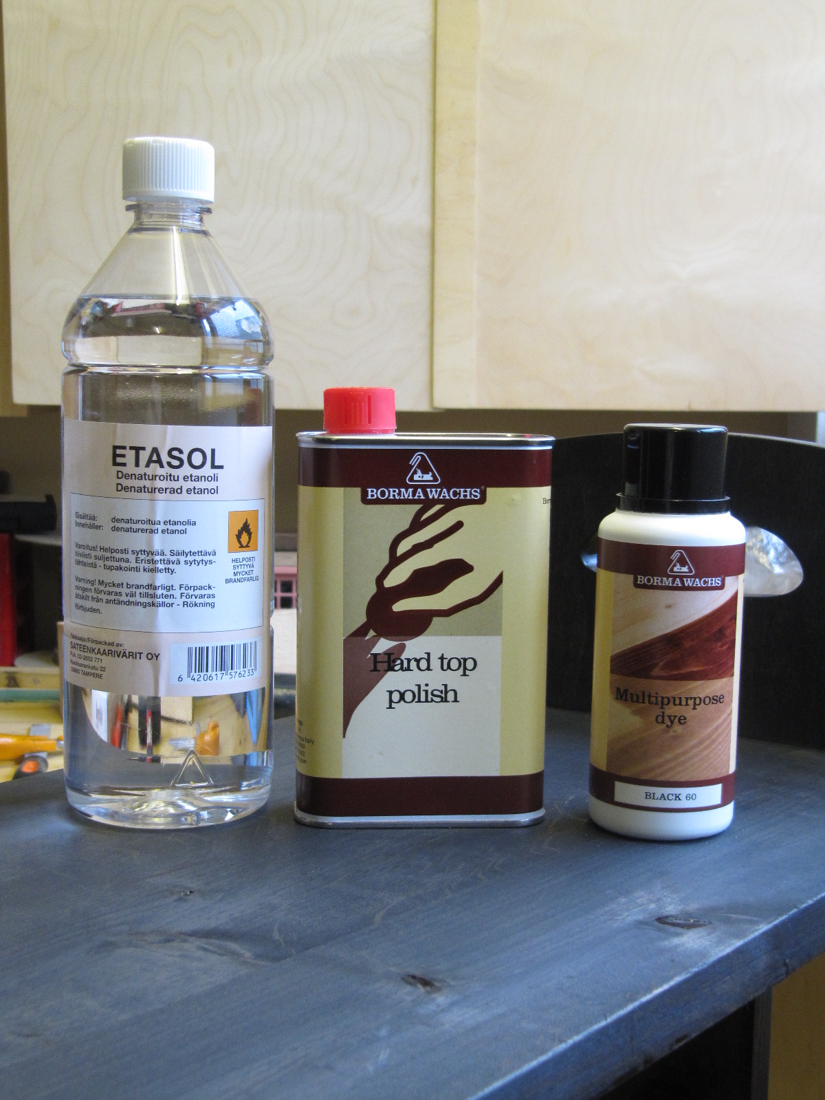 Nyt päästään pitakäsittely-vaiheeseen. Teen penkin Borma Wachsin Kovalla Sellakkapuliturilla (=lakka), minkä värjään saman yrityksen valmistamalla mustalla Petsitiivisteellä.