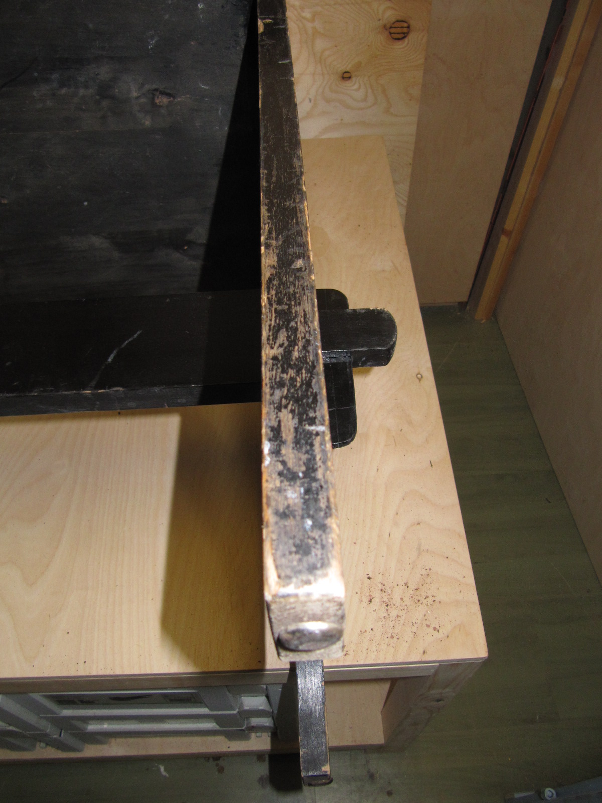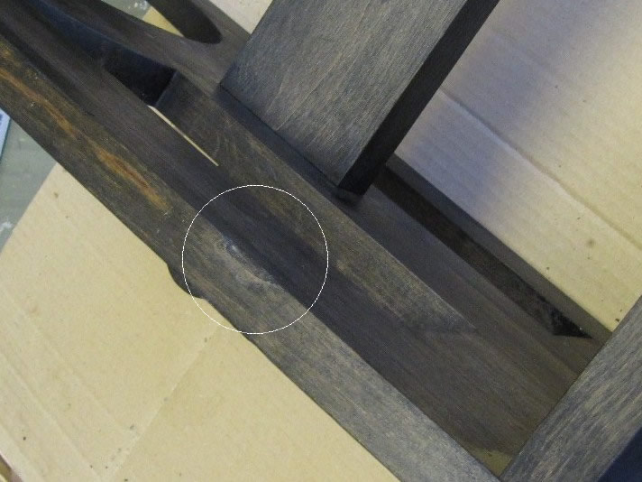 Sitten siirryn paikkaushommiin. Jalan sivusta on lohennut palanen. Käytän paikauksessa sellakkaa. Penkissä on aiemminkin paikkattu oksakohtia sulatetulla lakalla.