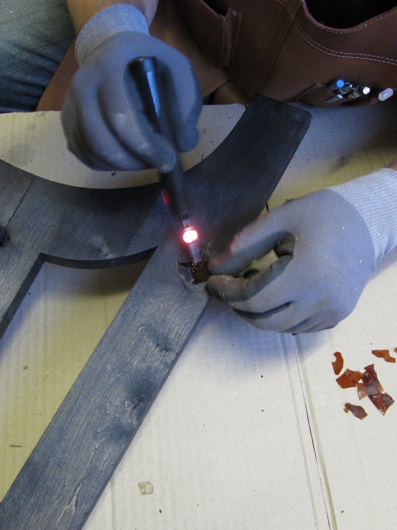 Laitan sellakkahiutaleen vaurion kohdalle ja sulatan tätä kaasukolvilla. Tällöin sellakka sulaa ja ottaa kiinni puuhun.