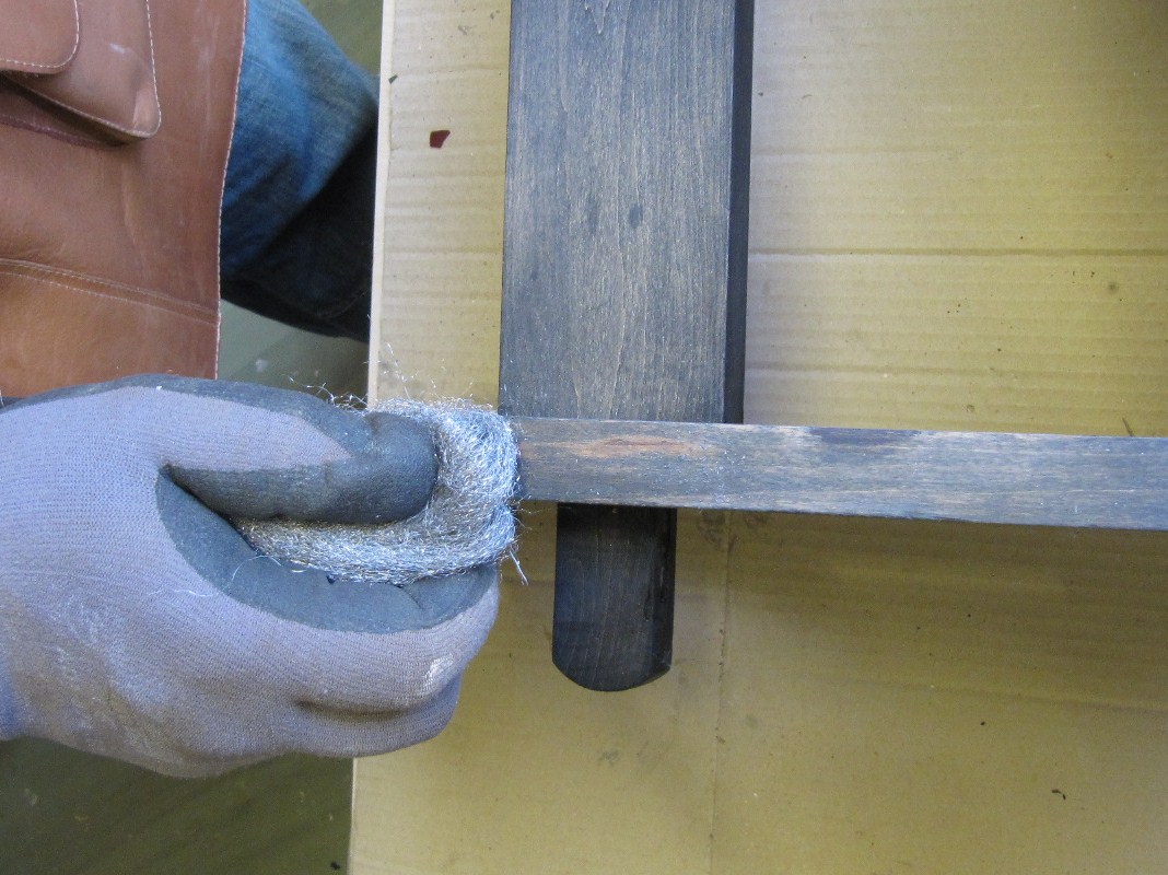 Suoritan välihionnan neljän nollan teräsvillalla, poistan pölyn. Tämän jälkeen levitän Kovaa Sellakkapulituria jota EI ole sävytetty. Ohennan sellakkaa noin 10 prosenttia Etasolilla. Käytän edelleenkin sivellintä.