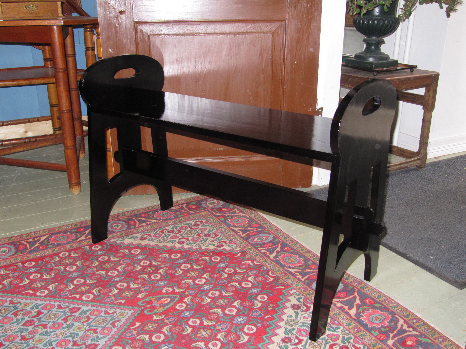 Penkin pinnat ovat kolhiintuneet ja kuluneet. Väri on haalistunut ja lakka kulunut osittain pois. Kuitenkin, penkki on jäykkä ja liitokset ovat ehjät, joten tästä selvitään uusimalla pintakäsittely ja muutaman kolon kittauksella.