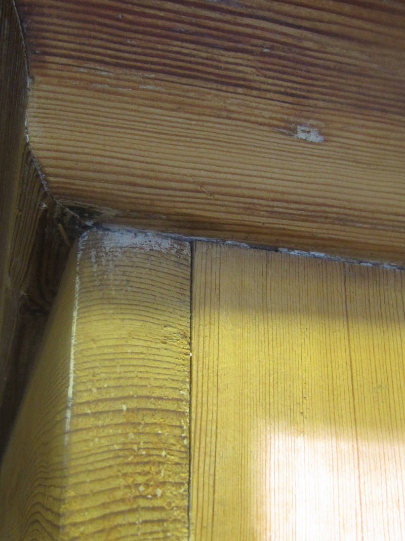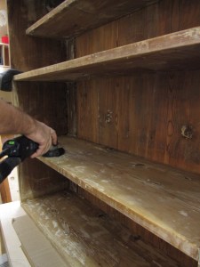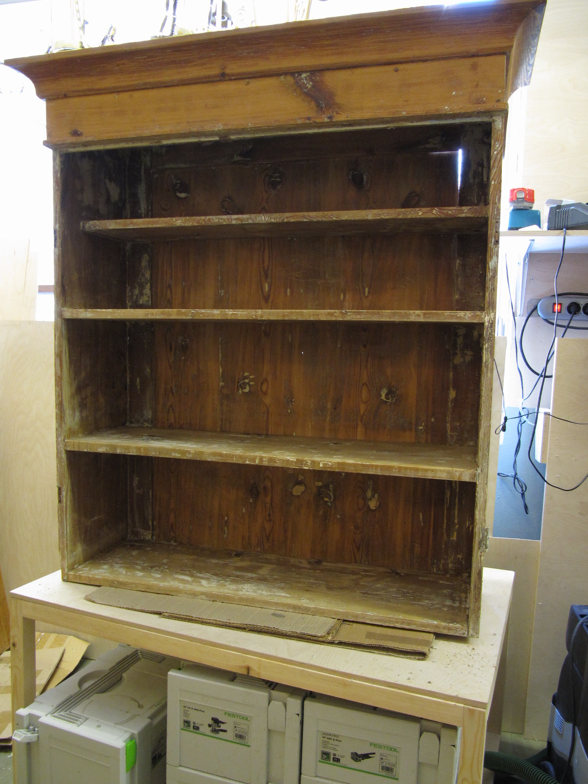 Pohjustan kaapin sellakalla ennen maalausta. Pohjusteen valmistan Sateenkaarivärin Sellakasta; 1 osa sellakkaa ja 1 osa etanolia (Etasol). Tällöin vältyn ikävältä yllätykseltä, että vanhan maalin jäämät värjäävät uutta maalipintaa ja muuttaisivat kaapin sävyä. Samalla ehkäisen vanhasta puusta mahdollisesti tulevaa ummehtunutta hajua, koska tulen käyttämään hengittävää vesiohenteista maalia. Kaapissa saattaa olla käsittelyistä huolimatta vahajäämiä, sellakka parantaa myös maalin tarttuvuutta.