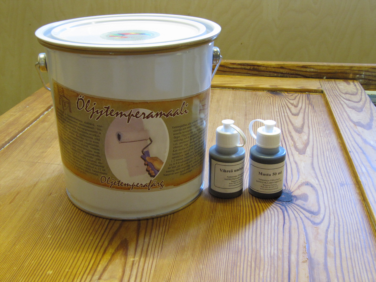 Kaappi on ollut jossain vaiheessa vaaleanharmaa. Siksi on mielestäni luontevaa päätyä tähän värisävyyn. Maalina käytän Sateenkaarivärin valmistamaa Öljytemperamaalia, sävytyksen teen Vesiväreillä (vihreä umbra ja musta). Maalina olisi voinut käyttää myös Vanhanajan Kaseiinimaalia. Edellä mainitut ovat vesiohenteisia ja antavan kauniin himmeän pinnan.