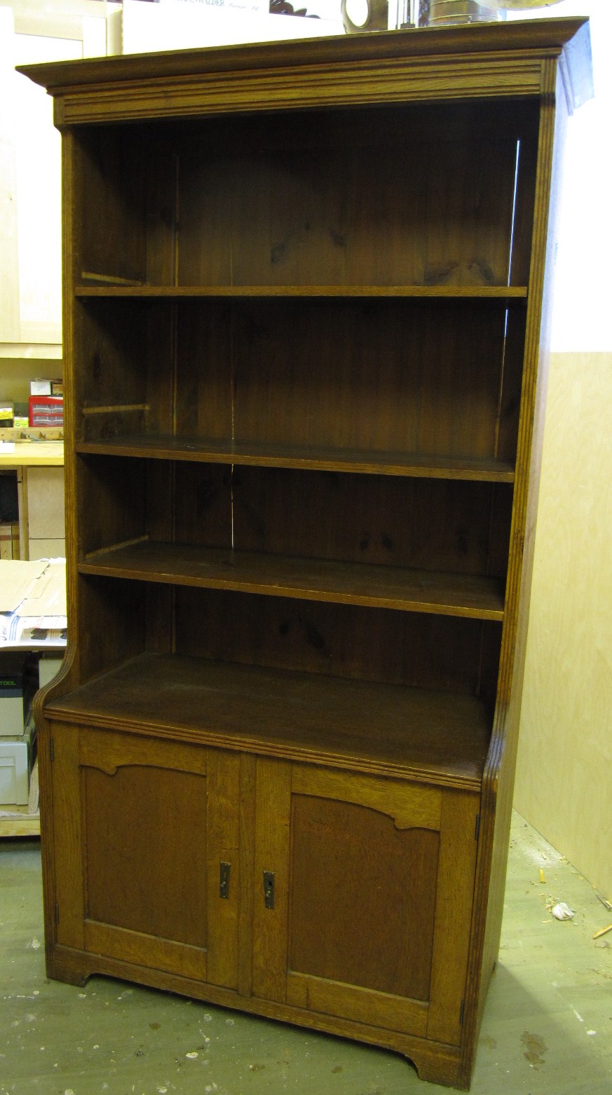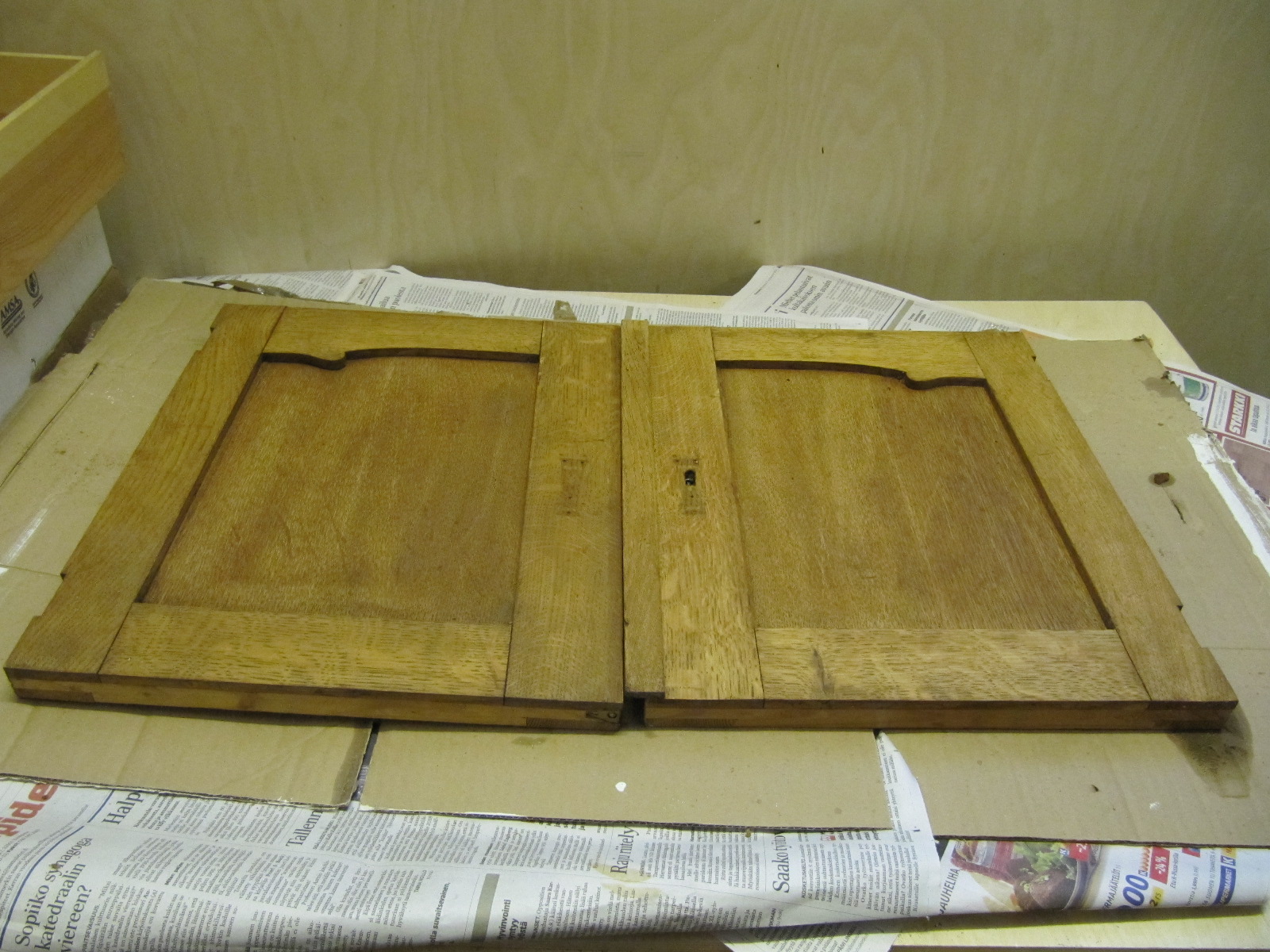 Ensimmäiseksi irrotin ovet rungosta ja hyllyjen kannattimet. Ovista irrotin myös saranat ja helat. Seuraavaksi pesin kirjahyllyn kauttaaltaan Etasolilla poistaakseni epäpuhtauksia. Samalla vanha sellakka pehmenee.