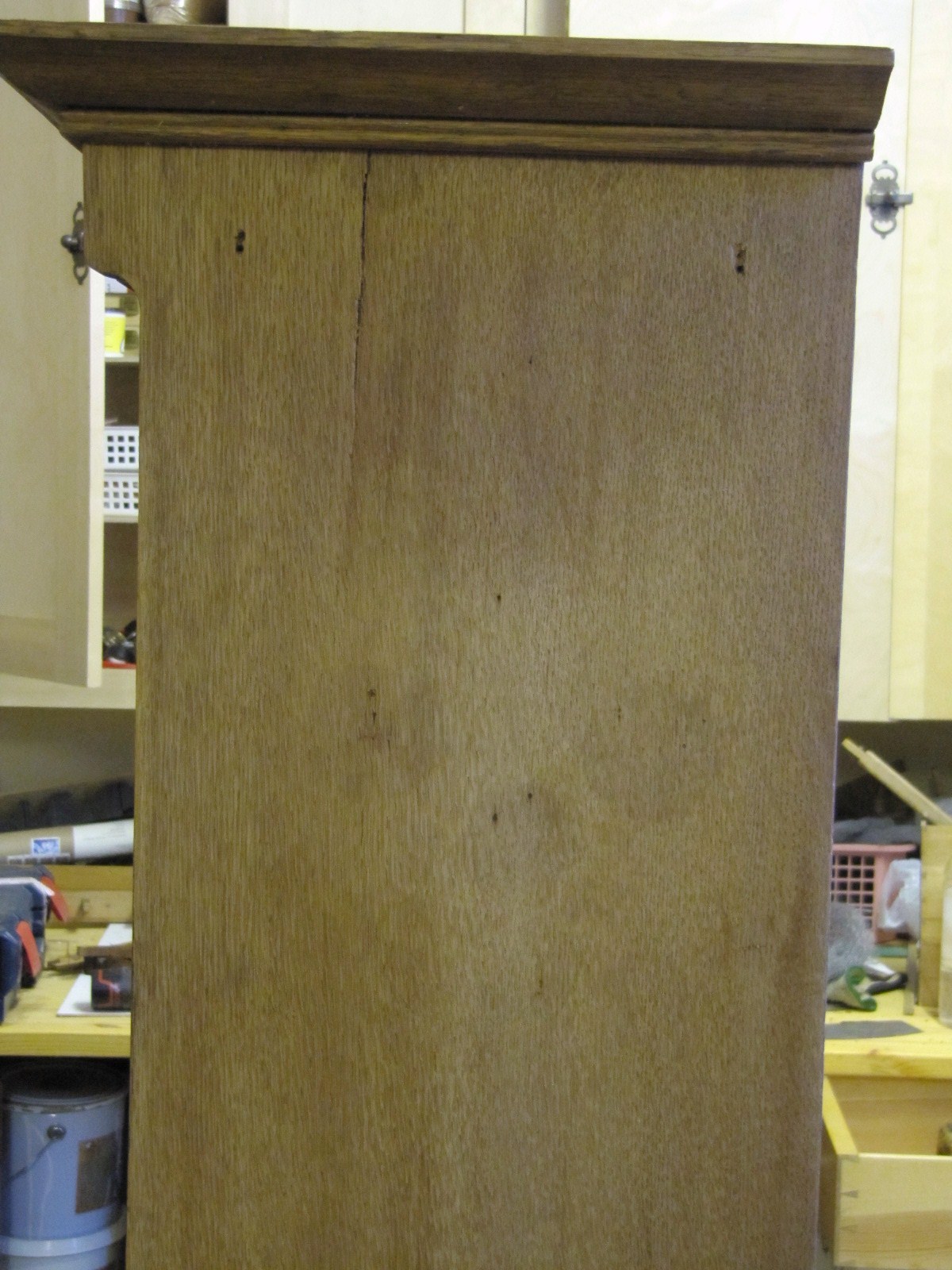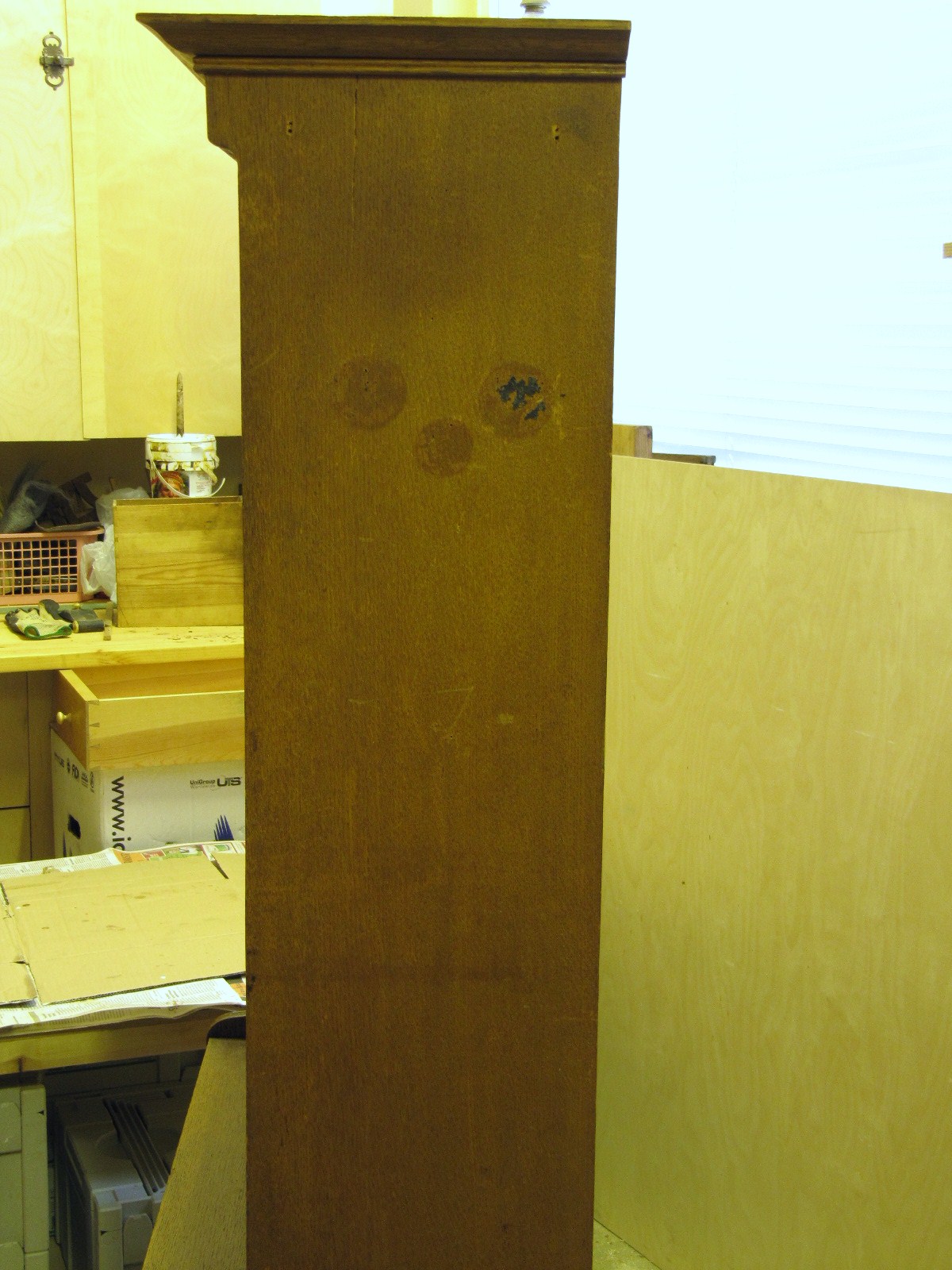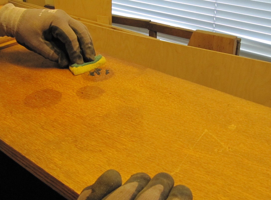 Tarrojen liima on aiheuttanut tummentumia. Vaurio ei lähde helposti pois, vaan se on syvällä puussa. Kirjahyllyä ei voi hioa kovasti, koska sivut on viilutettu ja aina on vaarana että ohut viilu hioutuu puhki. Samoin katsoin voimakkaiden kemikaalien käytön tarpeettomaksi, vanhassa kun saa mielestäni olla elämän merkkejä.