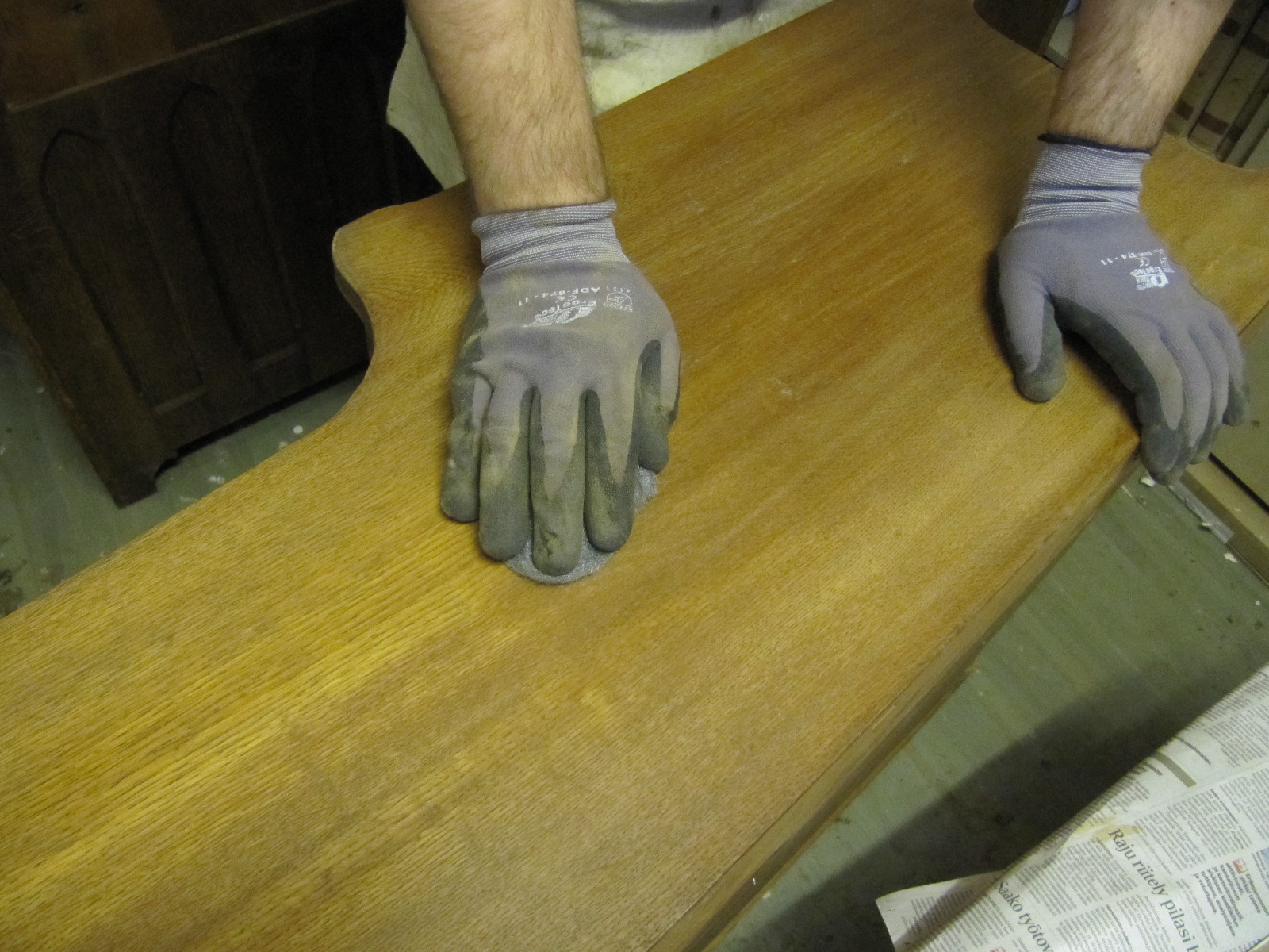 Sellakattu pinta kuivui noin tunnin, jonka jälkeen hion pinnat hienolla teräsvillalla (0000). Hionta pölyn pyyhin pois. Tämän jälkeen toistin sellakkauksen vielä kaksi kertaa.
