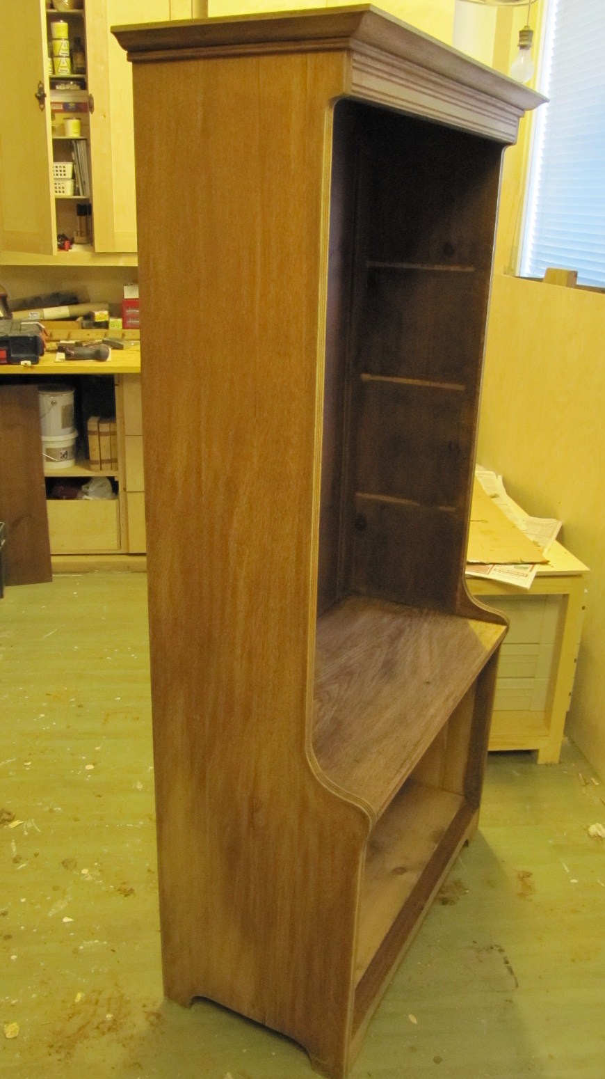 Lakaksi valitsin Sateenkaavivärin valmistaman Sellakan jota sävytin vähän Petsitiivisteellä. Hyllyn sisäpinta myös sellakattiin.