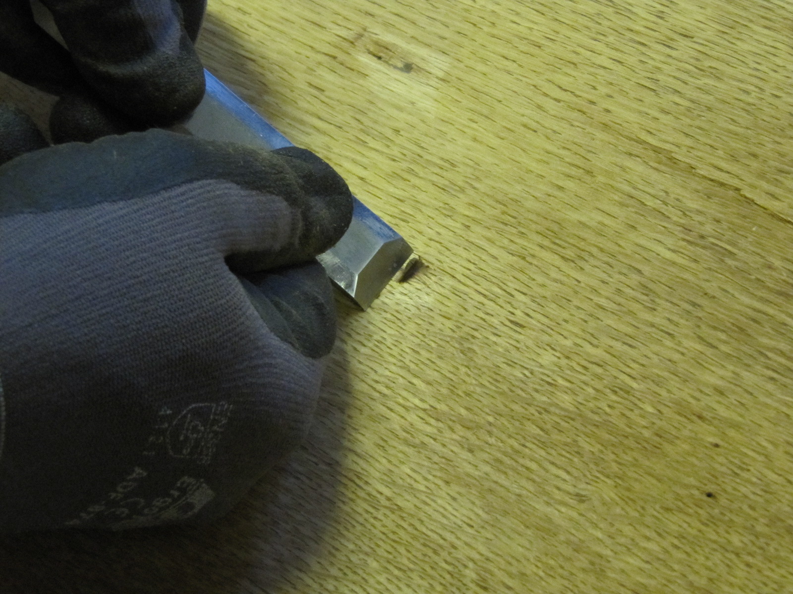 Kirjahyllyssä olleet kolot paikkasin Pehmeällä Vahakitillä. Väriksi valitsin tumman tammen. Lämmin vahakitti pehmenee käsissäni pyörittämällä. Peitin reijän vahan palasella ja painoin sen paikalleen sormella. Tasotin kitatun kohdan taltalla.