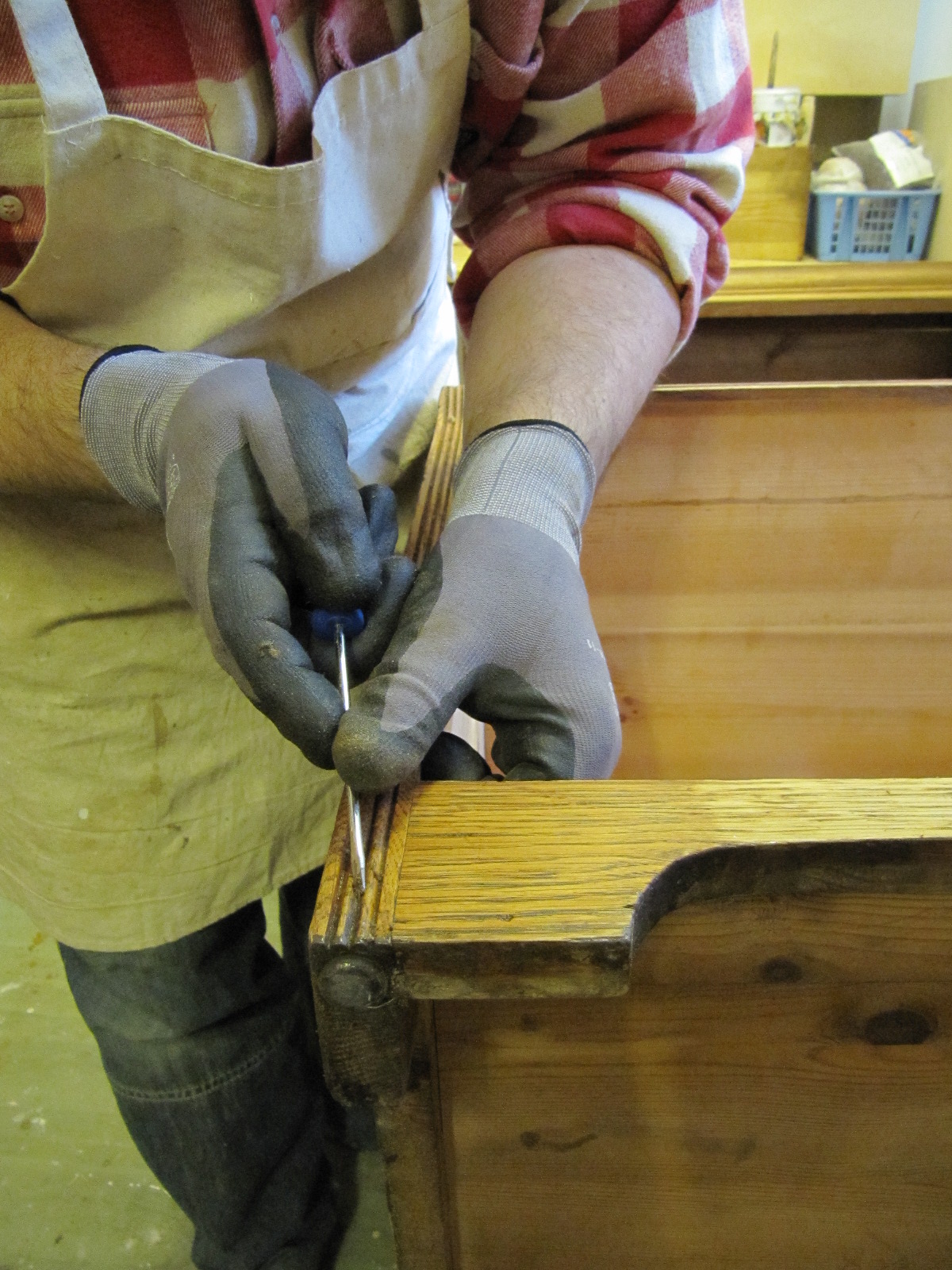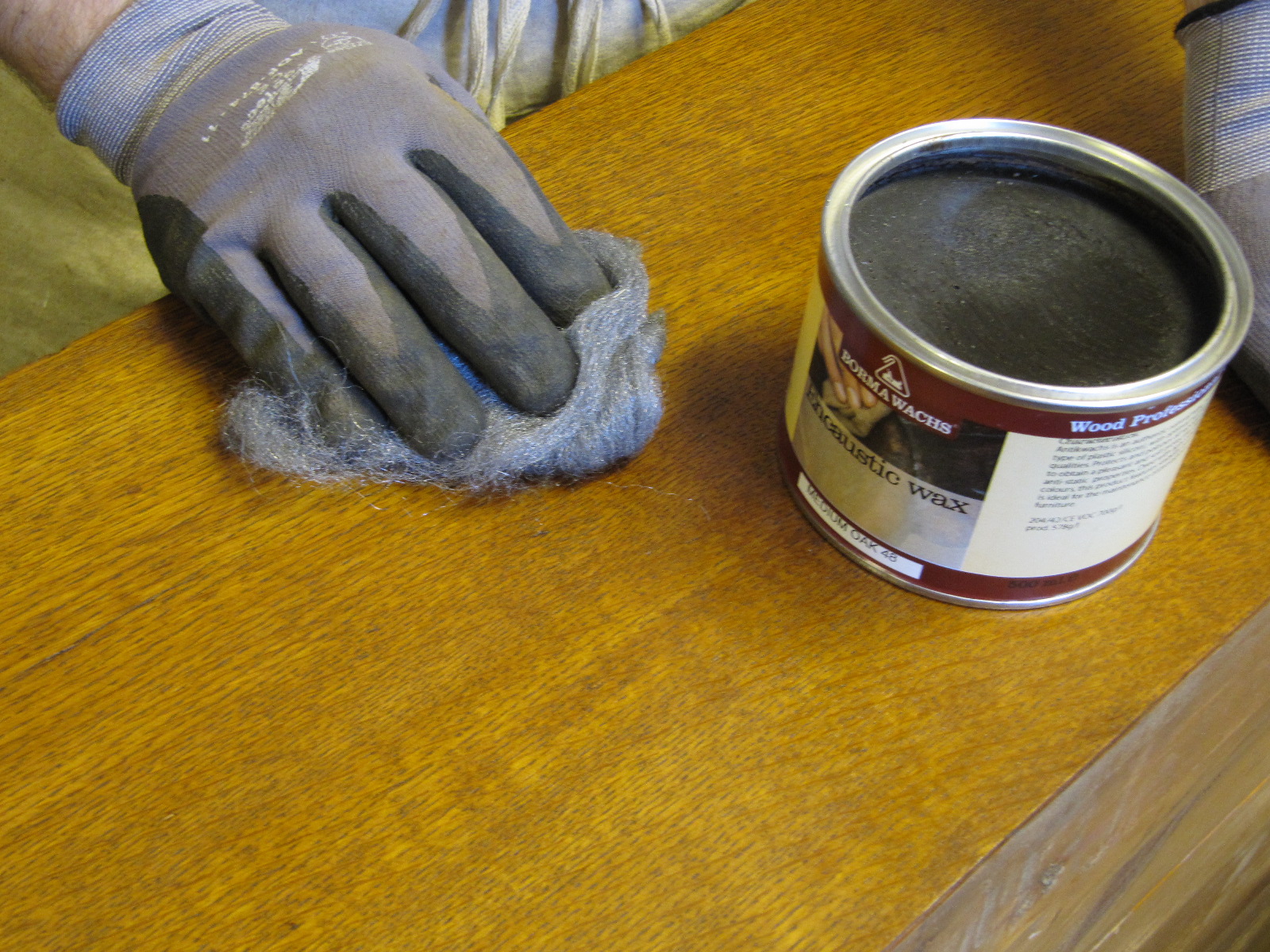 Seuraavana päivänä vahasin sellakatut pinnat Antiikkivahalla (tumma tammi). Levitin ohuen kerroksen vahaa hienolla teräsvillalla (0000). Vahattu pinta kuivui noin tunnin, jonka jälkeen kiiloitin pinnat pehmeällä harjalla.