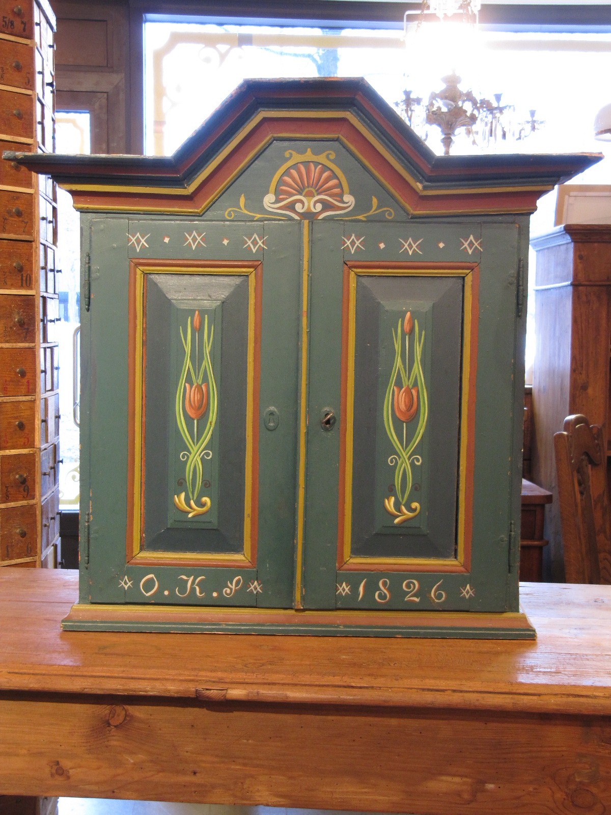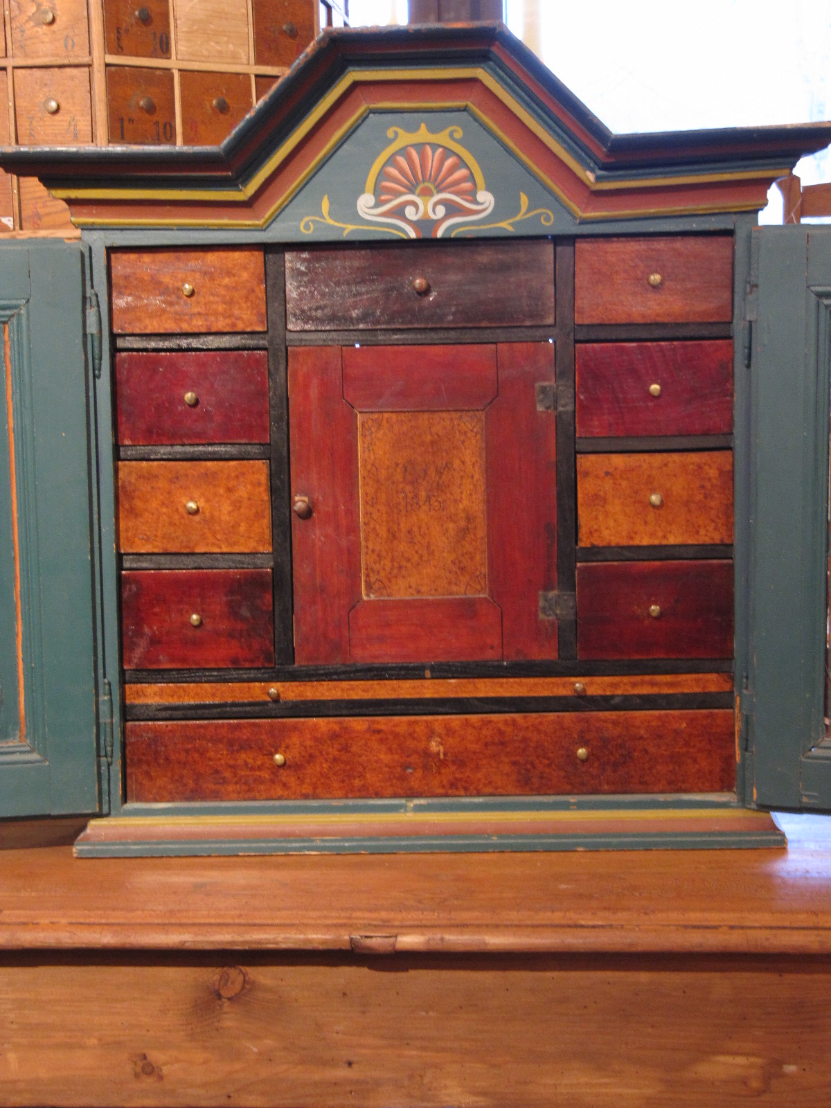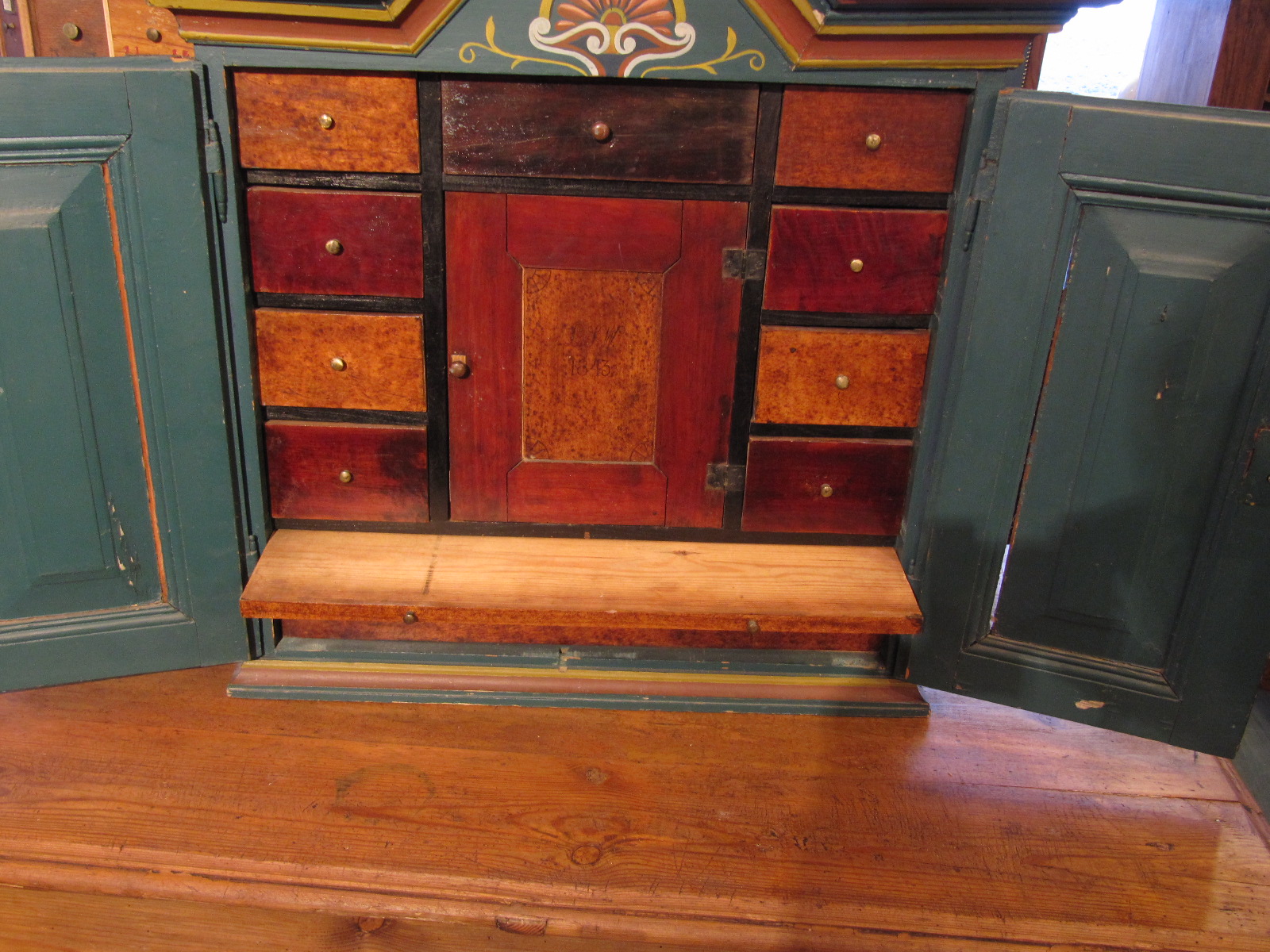 Tämä talonpoikaiskaappi on talonpoikainen versio kabinettikaapista. Kaapin sisällä on kymmenen laatikkoa ja kaappi, sekä yksi salalokero ja ulosvedettävä laskualusta. Se on todennäköisesti toiminut maustekaappina.
