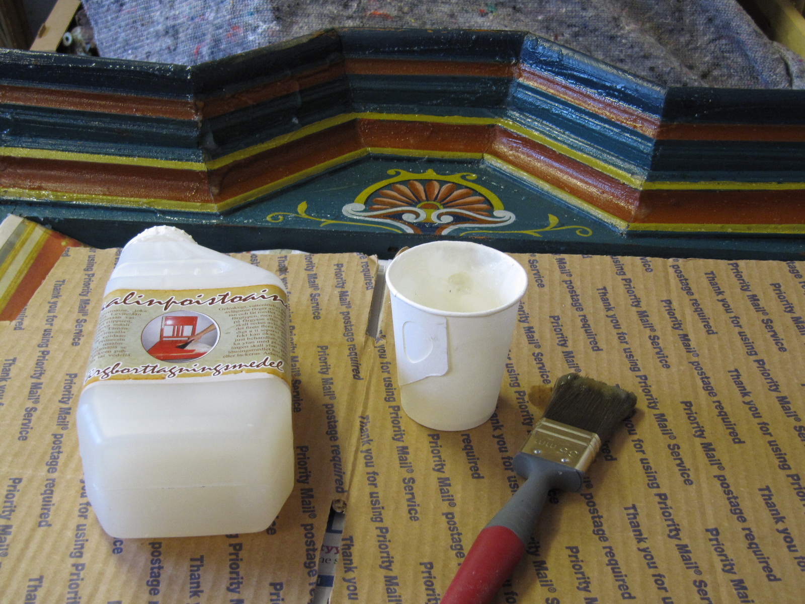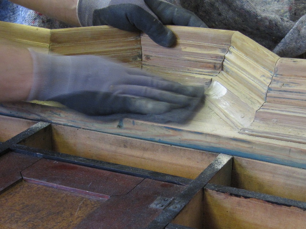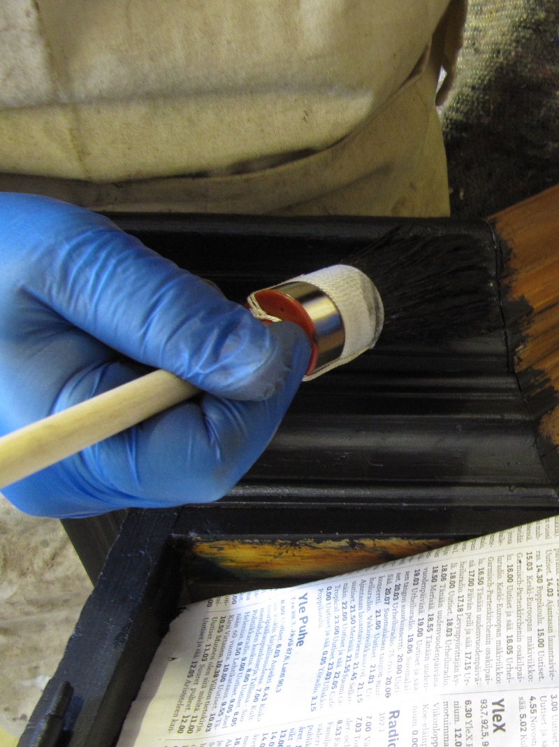 Aloitin projektin maalinpoistolla. Tässä käytin Sateenkaarivärin valmistamaa Maalinpoistoainetta. Työn edetessä huomasin, että ylälistassa osa profiileista oli kitattu piilloon. Tällöin päätin irroittaa kaapista listat, jolloin maalin- ja kitinpoisto on helpompaa. Kaapissa oli kaksi vihreää maalia ja näiden maalien välissä kittikerros. Alimmaisena oli jäänteitä mustasta maalista. Tämä talonpoikaiskaappi on siis ollut alunperin musta, niin kuin esikuvansa kabinettikaapit yleensä olivat. Talonpoikaisia versiota on olemassa myös tummanvihreitä. Päätin jo tässä vaiheessa että kaapista tulisi musta. Maalin poistamisen jälkeen pesin kaapin Etasolilla.