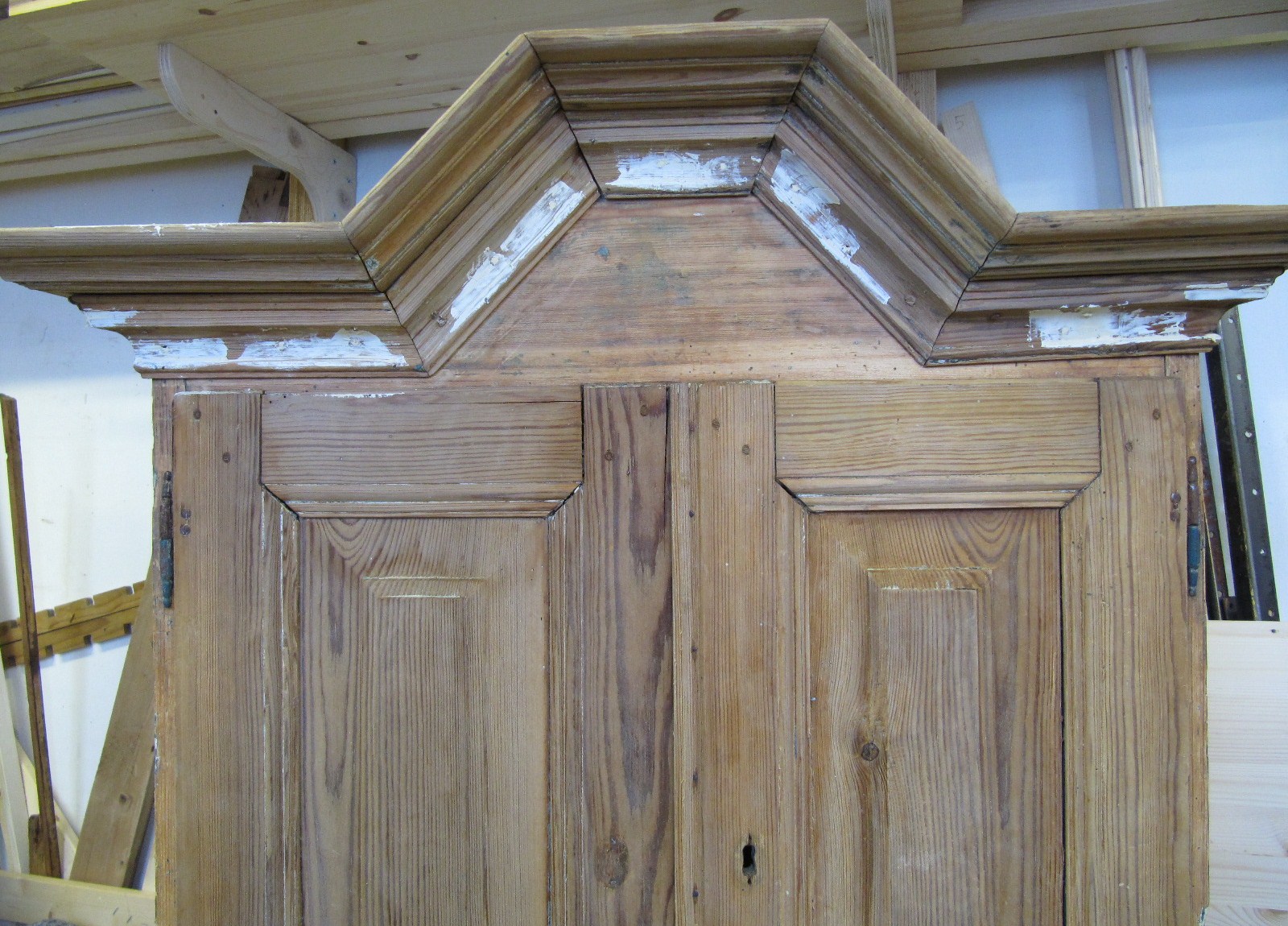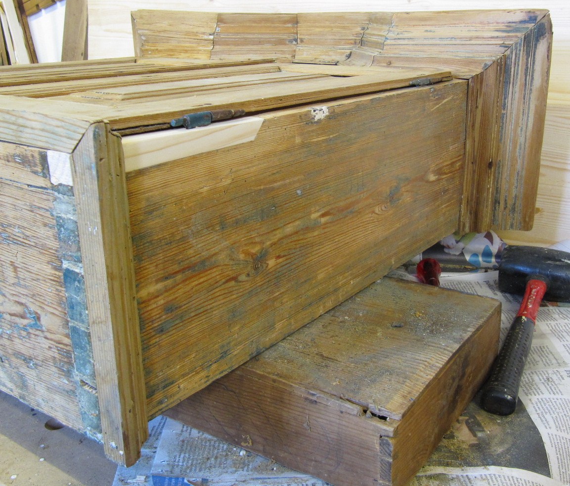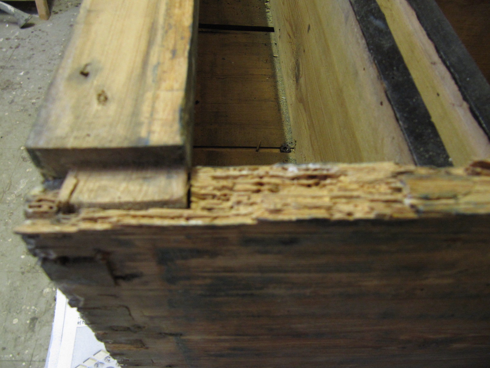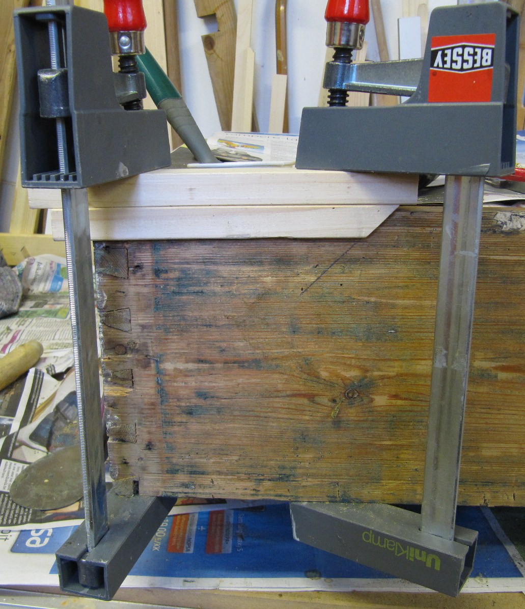 Tuholaisen pehmentämän materiaalin poistin taltalla. Tein puusta paikan. Koska kaappi tulee maalatuksi, niin käytin melko uutta puuta paikkaukseen.