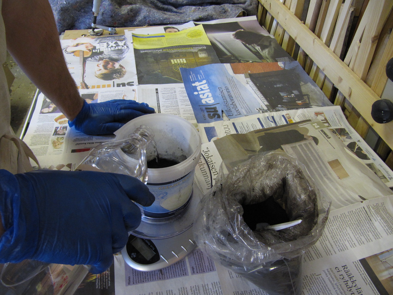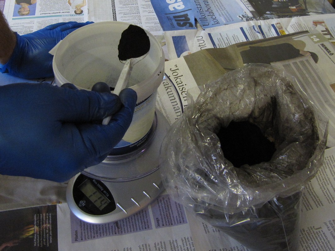 Aloitin maalin valmistamisen punnitsemalla 200g oksidinmustaa väripigmenttiä astiaan.
