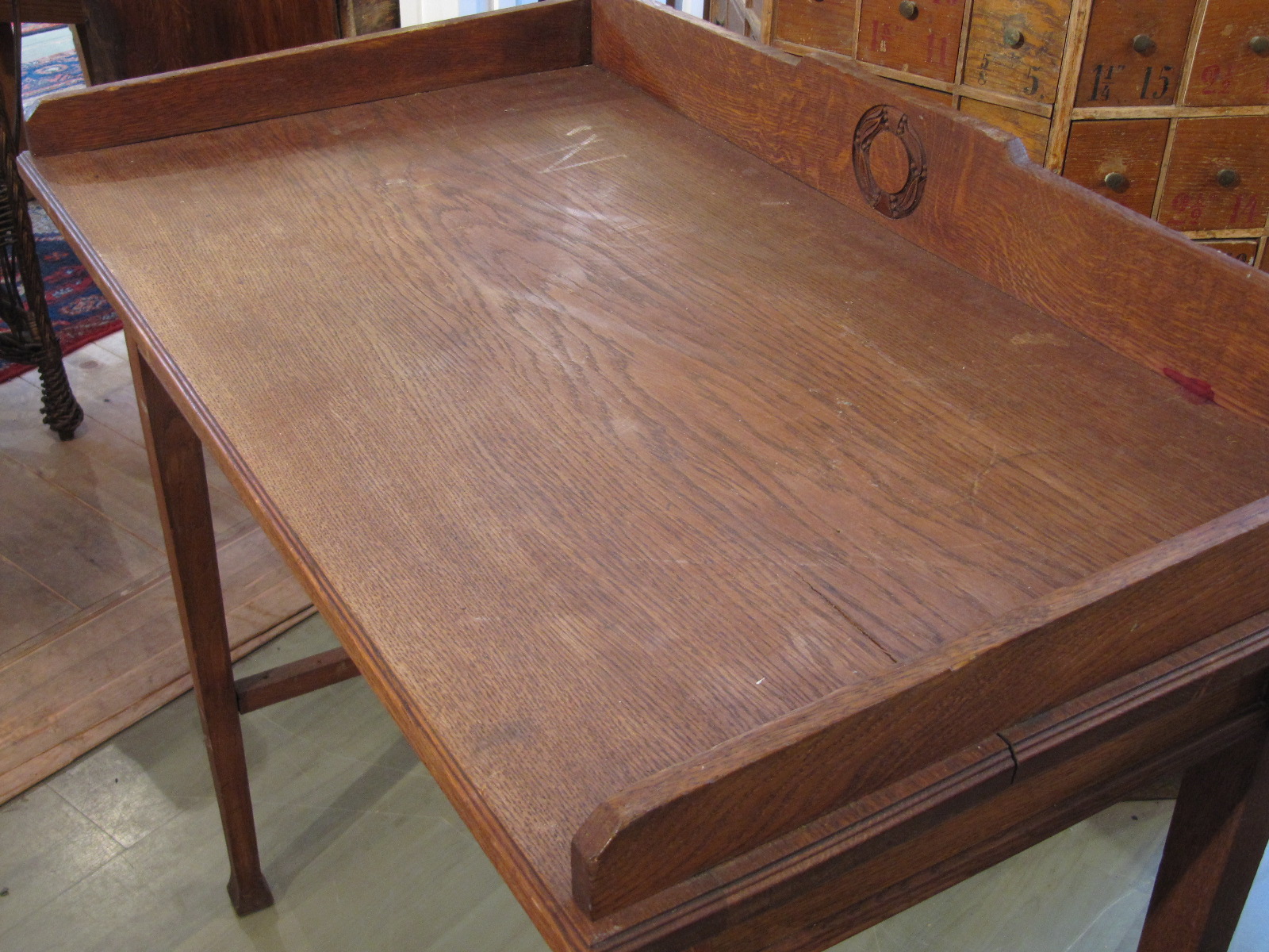 Poistin kaiteesta ja pöydän kannesta punaisen värin siklillä ja hiomahuovalla. Pöydän reunassa väri oli imeytynyt hyvin syvään, eikä lähtenyt kokonaan pois. Onneksi tämä kohta jää kuitenkin lähes kokonaan kaiteen alle. Tämän jälkeen esivärjäsin puhdistetut kohdat. Värjäämiseen käytin Borma Wachsin valmistamaa Korjauskynää (medium pähkinä).