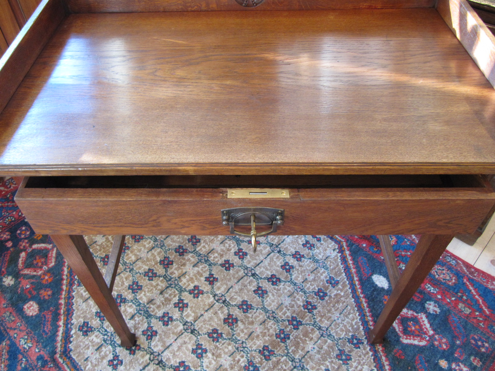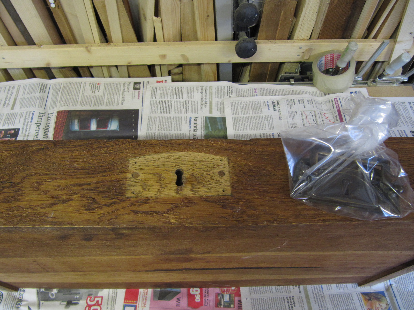 Antiikkivahattu pinta kuivui noin tunnin. Käsitellyt pinnat kiilloitin kankaan palalla. Kiiloituksen jälkeen kasasin pöydän, kiinnitin laatikkoon takaisin alkuperäisen helan ja uuden lukon.