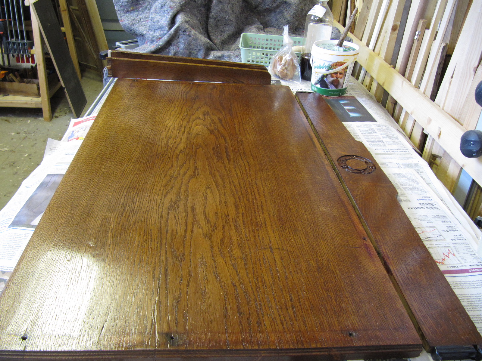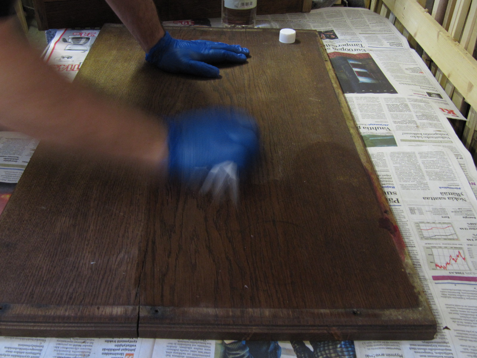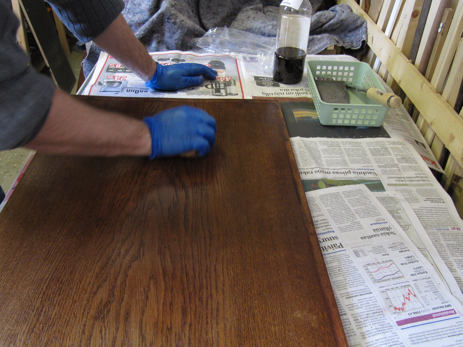 Viimeistelyn tein Antiikkivahalla. Sävynä oli medium tammi. Vahan levitykseen käytin teräsvillaa (0000).