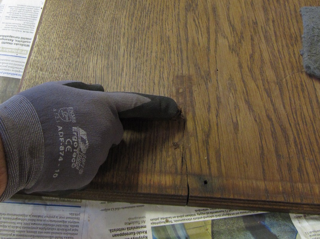 Paikkaamiseen käytin Borma Wachsin valmistamaa Pehmeää Vahakittiä. Värisävy oli tumma pähkinä. Vahakitti on helppo levittää ja helppo poistaa, jos tulevaisuudessa halutaan tehdä toisenlainen korjaus. Otin tangosta palasen jonka lämmitin käsissäni ja painoin sitä runsaasti halkeamaan.