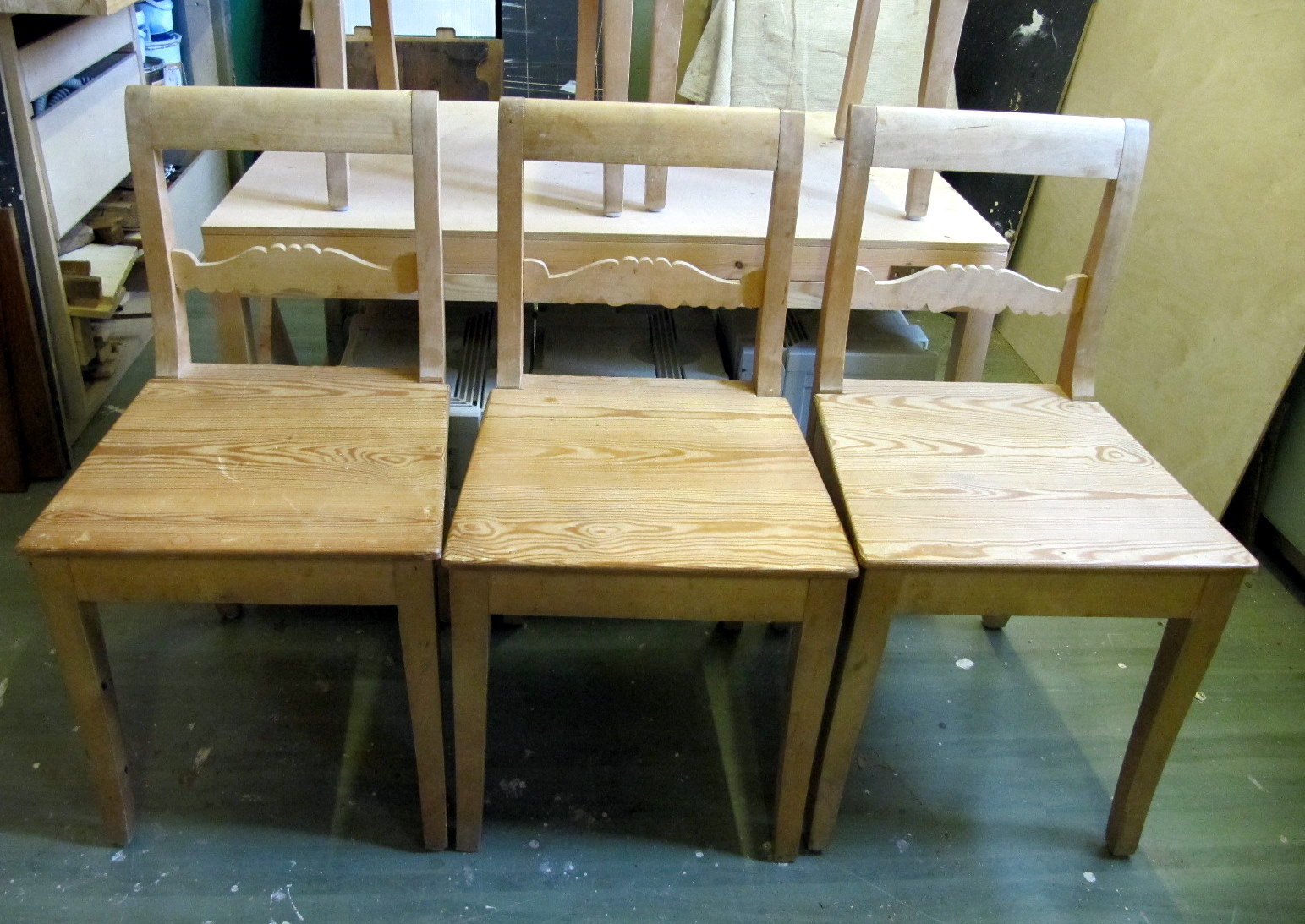 Tuolit ovat puuosiltaan hyväkuntoiset, joten niille ei tarvinnut tehdä mitään. Tarkastin tuolien liimaukset ja totesin että tuolit olivat tukevat. Edellisen kunnostuksen yhteydessä tuolit oli liimattu uudelleen.