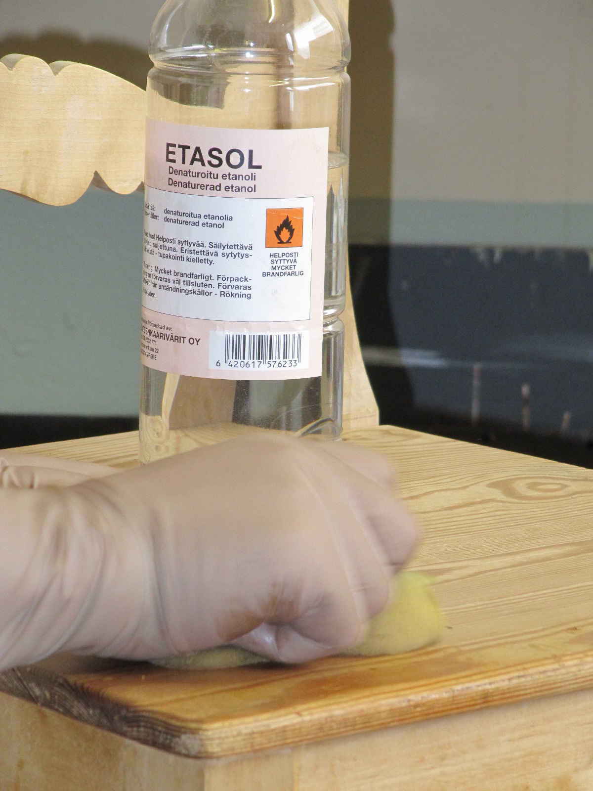 Puhdistin vanhan lakkapinnan Etasolilla ennen pintakäsittelyä. Tämän jälkeen hion pinnat kevyesti keskikarhealla teräsvillalla. Hiontapölyn poistin imurilla.