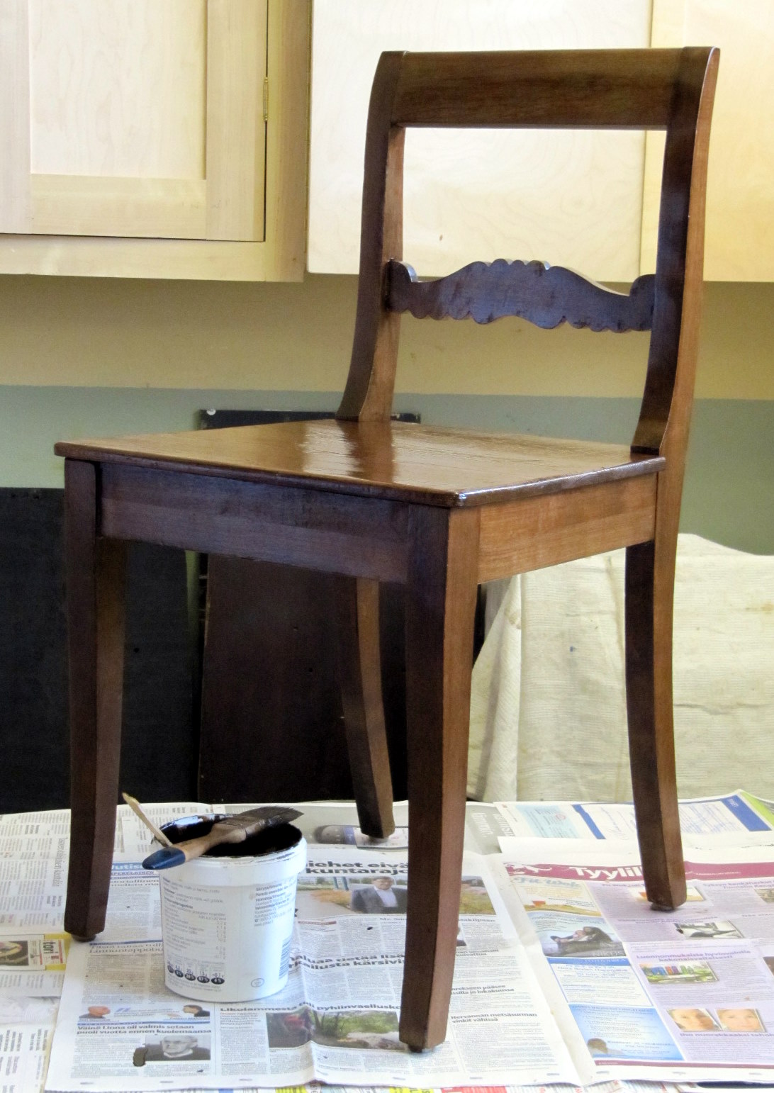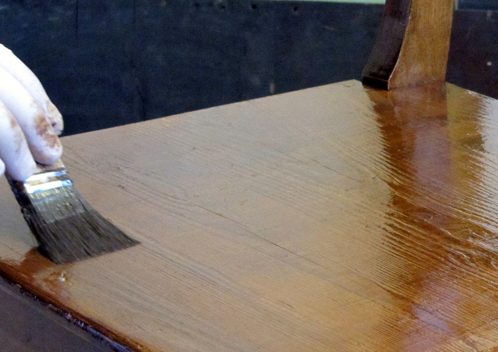Vanhanajan Hartsiöljylakasta valmistetun kuultomaalin levitin ensin voimakkaasti hiertäen, jotta maali ottaa varmasti hyvin kiinni vanhaan lakkapintaan kiinni. Tämän jälkeen tasoitin pinnan puunsyihin nähden poikittain.