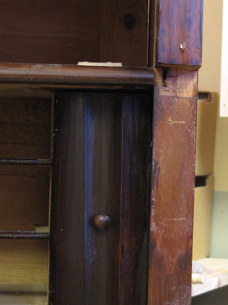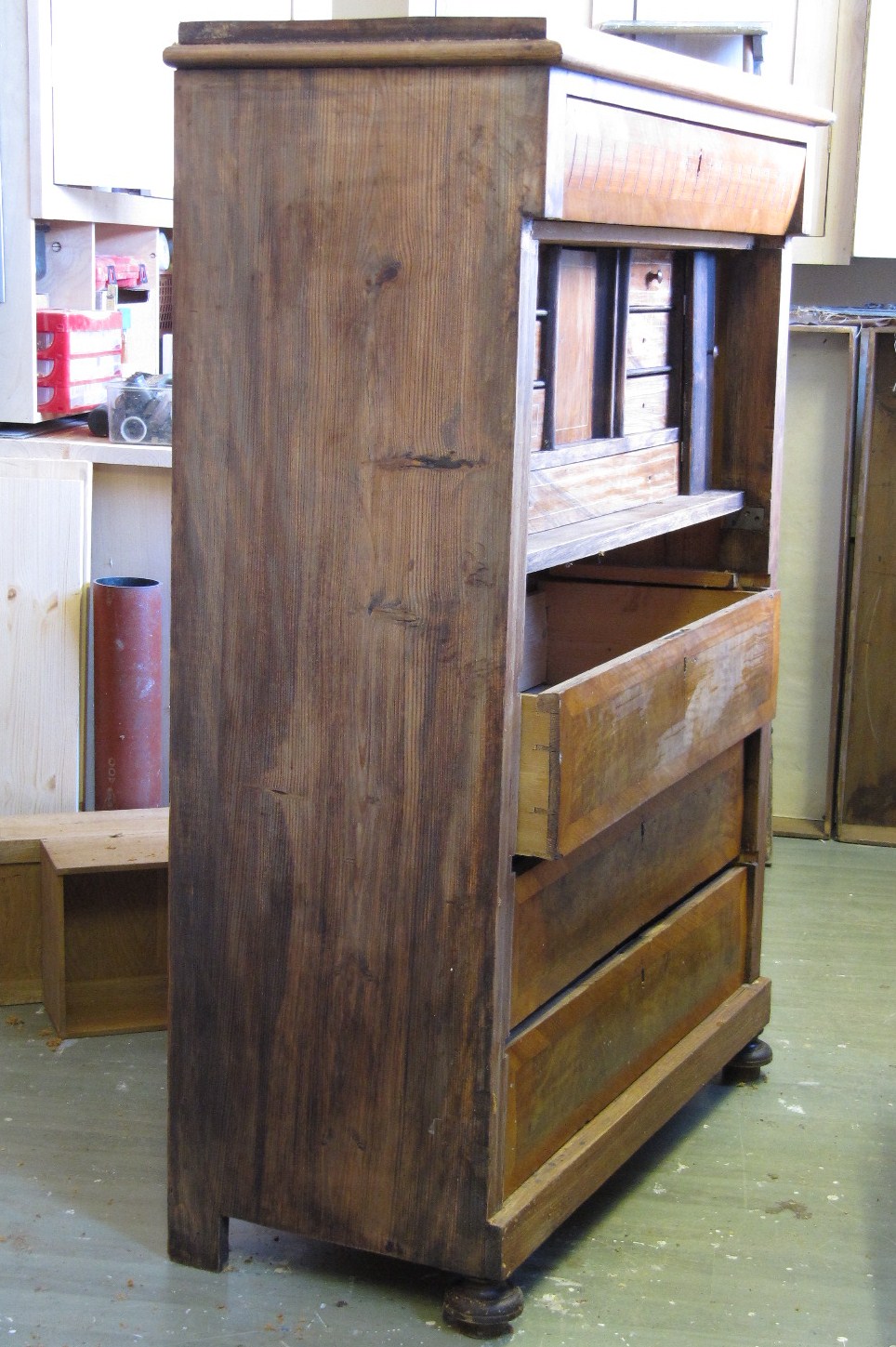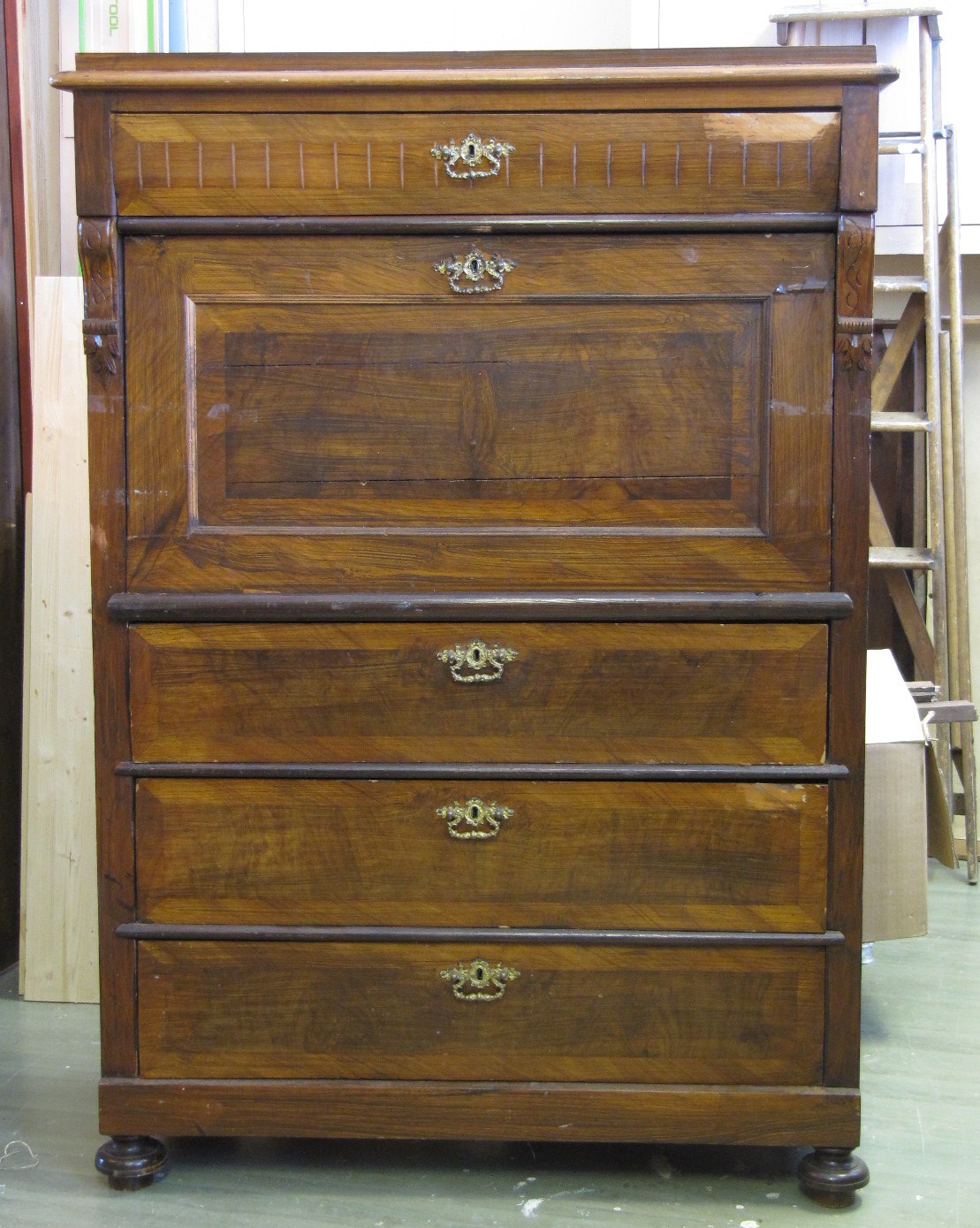Tämä ruotsalainen kirjoituslipasto on tehty 1870-luvulla. Aikaisempi omistaja on päättänyt ehostaa hienoa lipastoa petsilakalla. Ankean lopputuloksen näemme tässä.