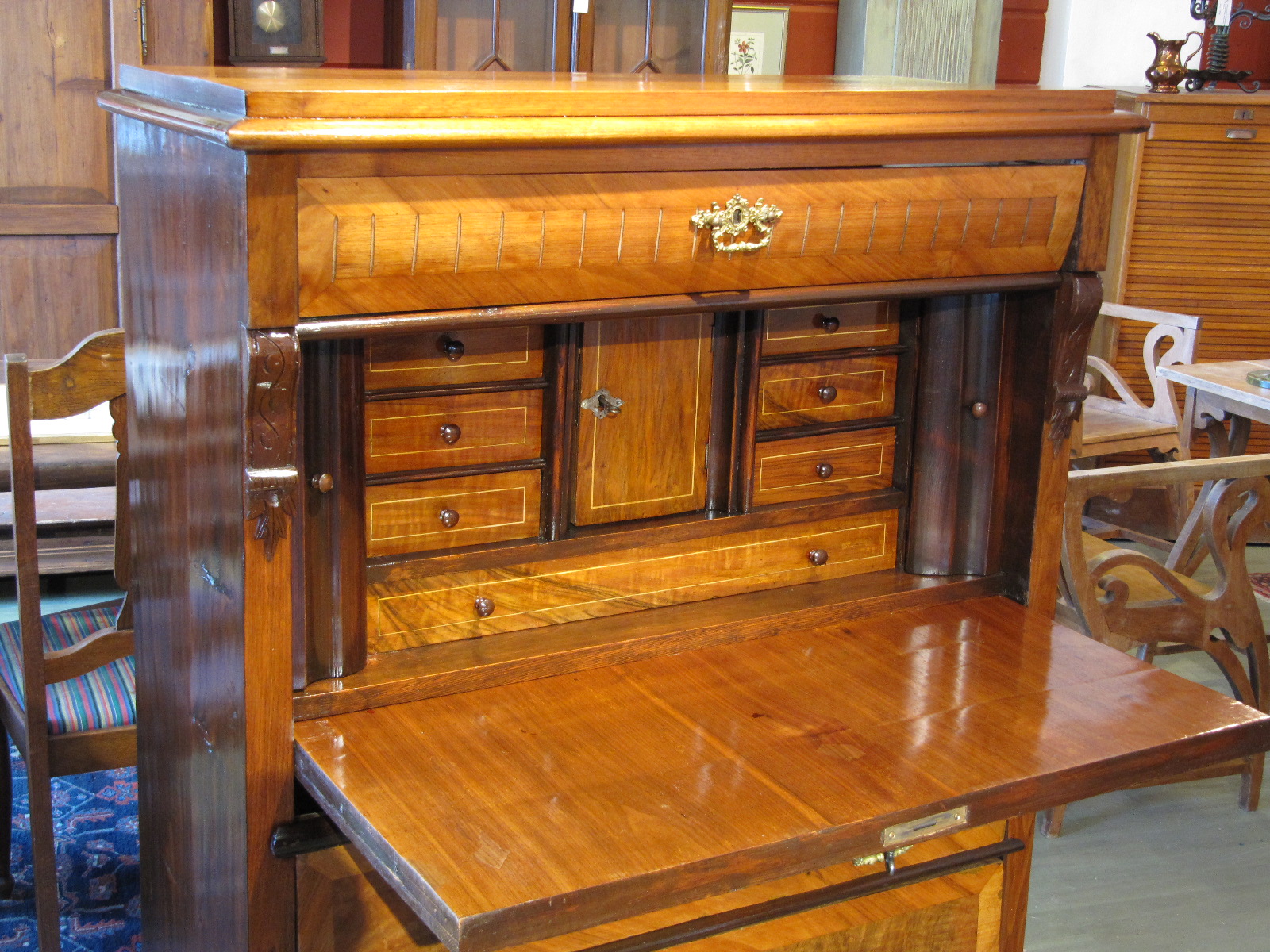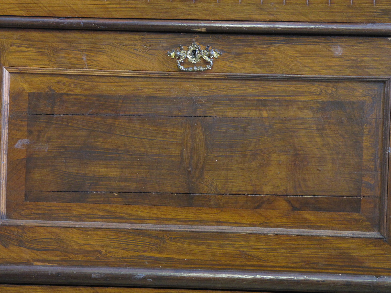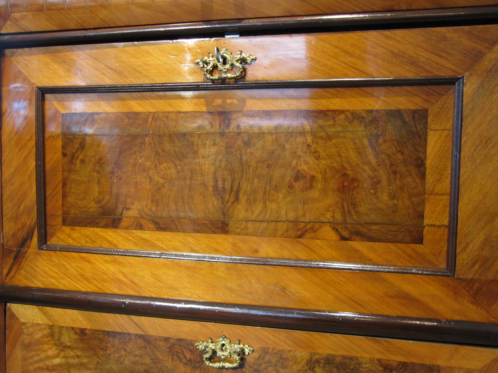 Pienten laatikoiden etuosaan ja oven verhoiluun on käytetty myös pähkinäviilua ja näihin on tehty hienot puu-upotukset vaalealla puulla. Sivukaapit on värjätty tummanruskeaksi. Laskulevyn sisäosassa on useita viiluvauriota.