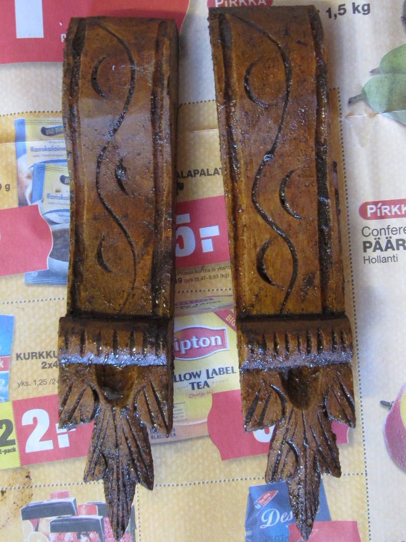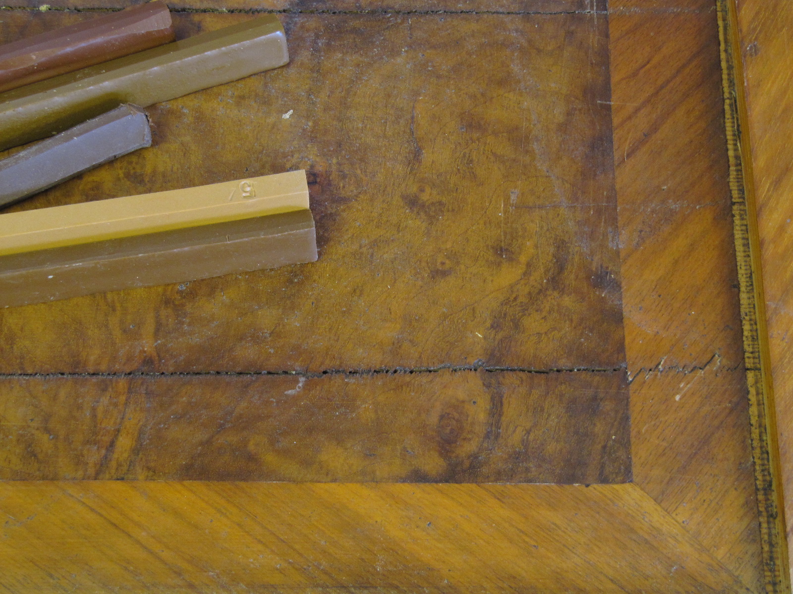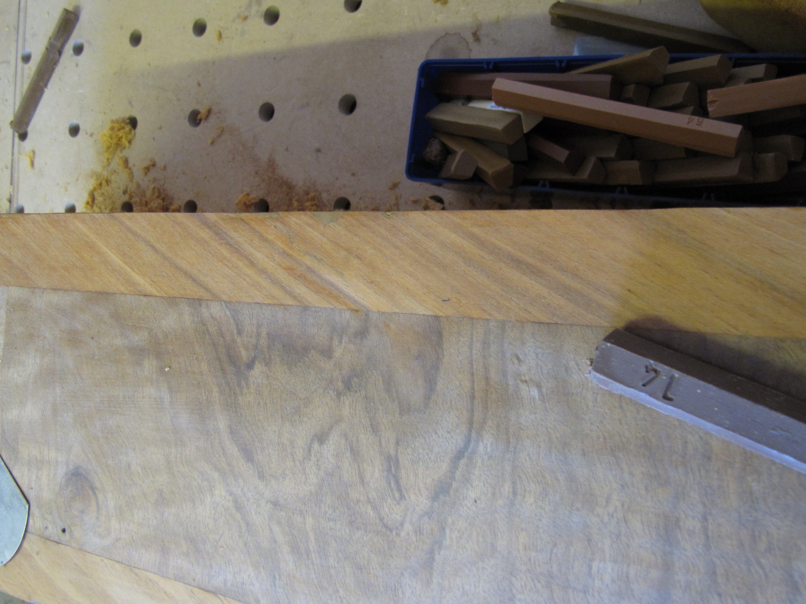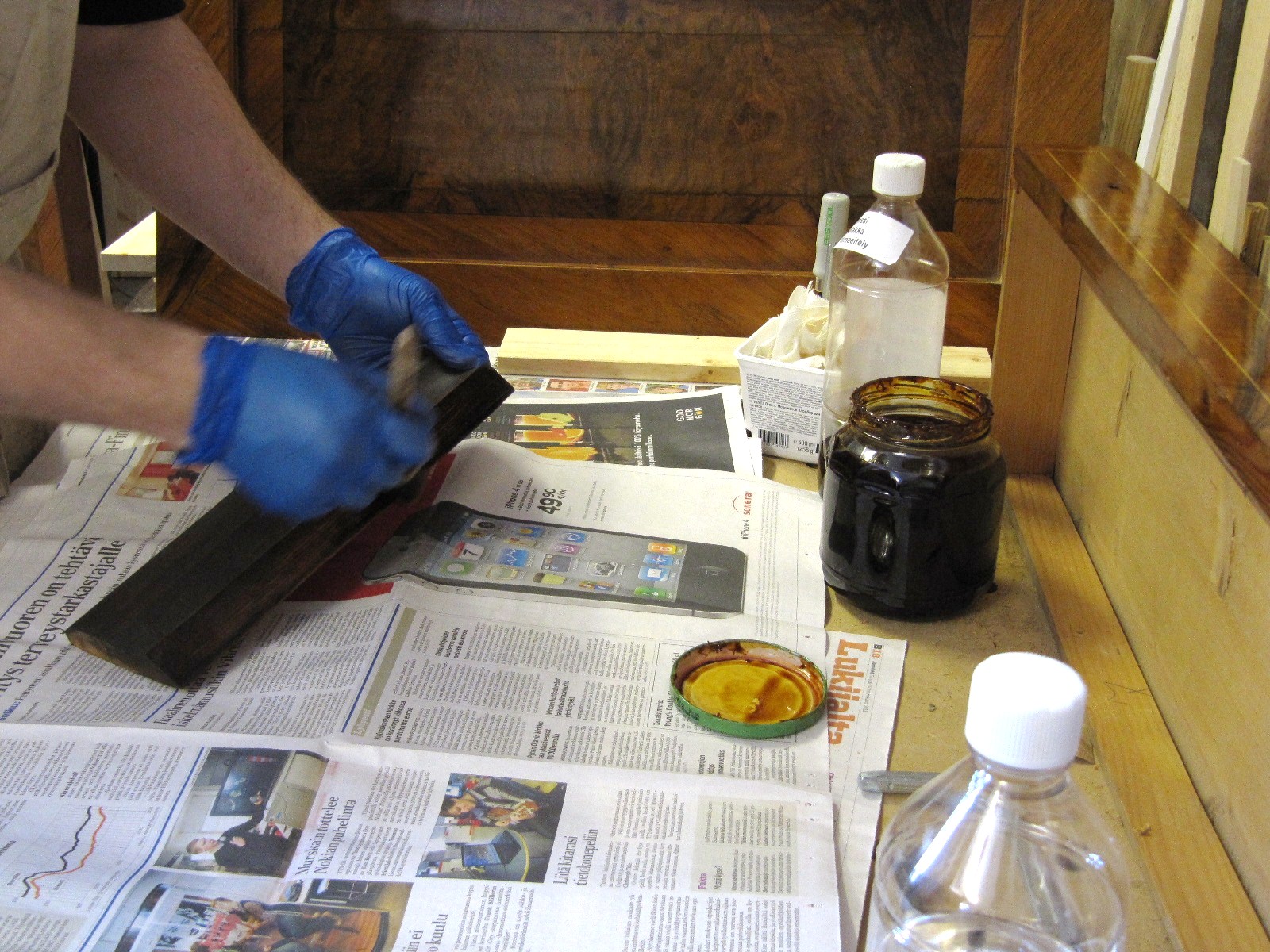 Laatikoiden viilutuksessa oli pieniä vauriota. Nämäkin korjasin pehmeällä vahakitillä.