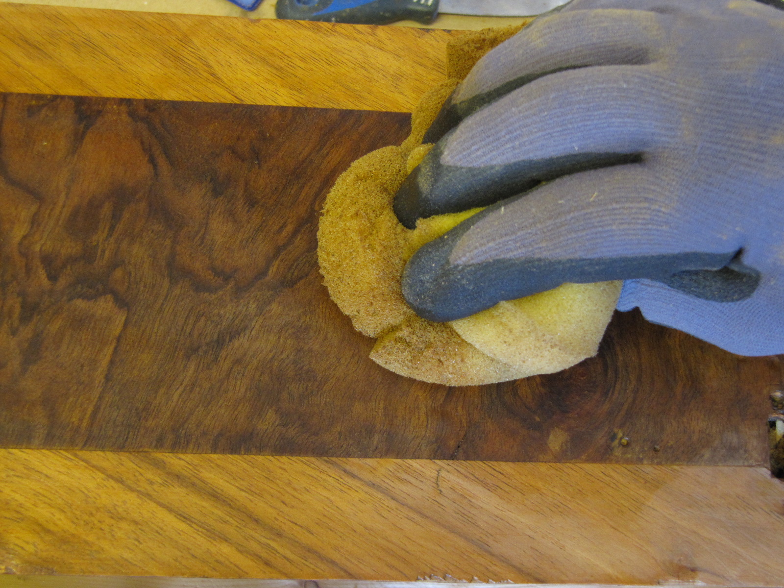 Viilutetut pinnat hion hiomahuovalla ennen kiilotusta. Kirjoituslipaston laatikot, laskulevyn ja kannen kiilotin sellakalla. Tähän käytin itsevalmistamaa viimeistelyyn sopivaa oranssia sellakkaliuosta. Oranssi sellakka korostaa pähkinäviilun kauneutta. Työn suoritin alusta loppuun kiillotustullolla. Kerroksia tein noin 60-70 kpl. En täyttänyt huokosia, halusin lipaston näyttävän vanhalta, mutta hyvin hoidetulta.