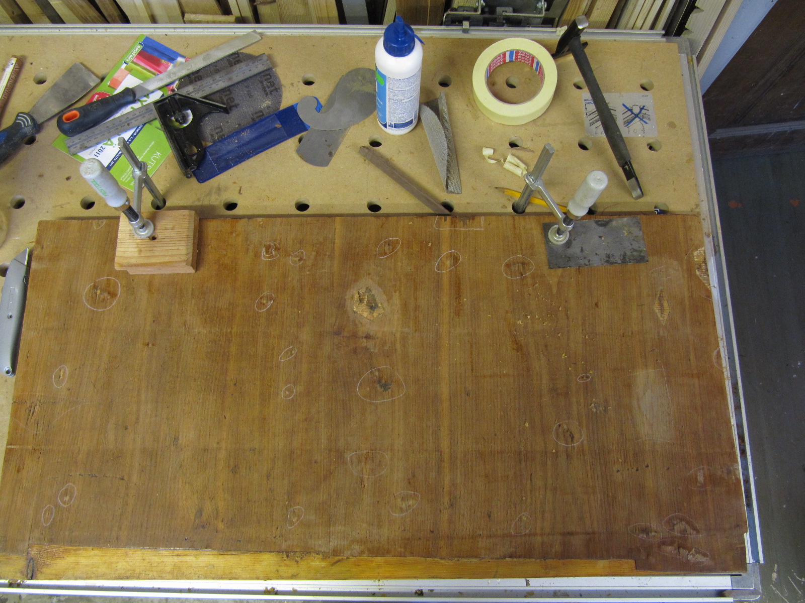 Laskulevyn sisäosassa oli useita viiluvauriota ja vanhoja sellakkakorjauksia. Paikkasin isomat vauriot pähkinäviilulla. Pienemmät vauriot täytin sellakalla.
