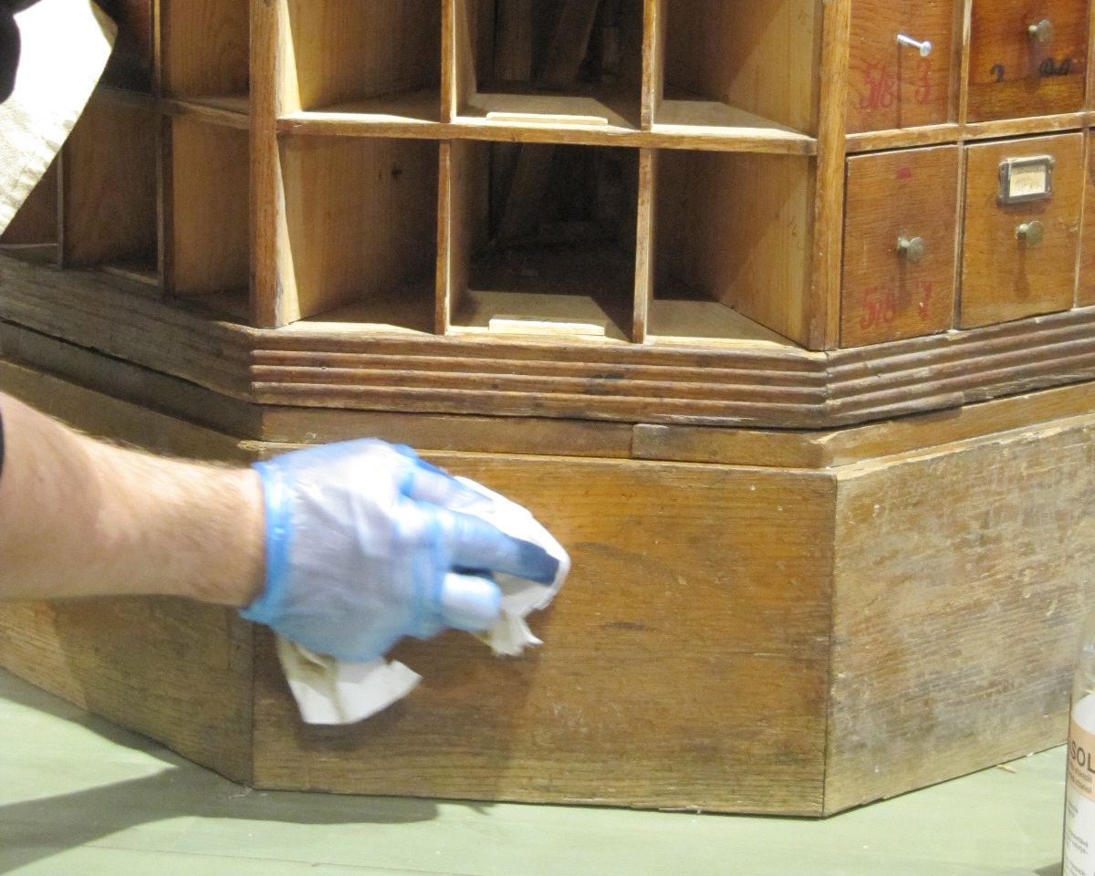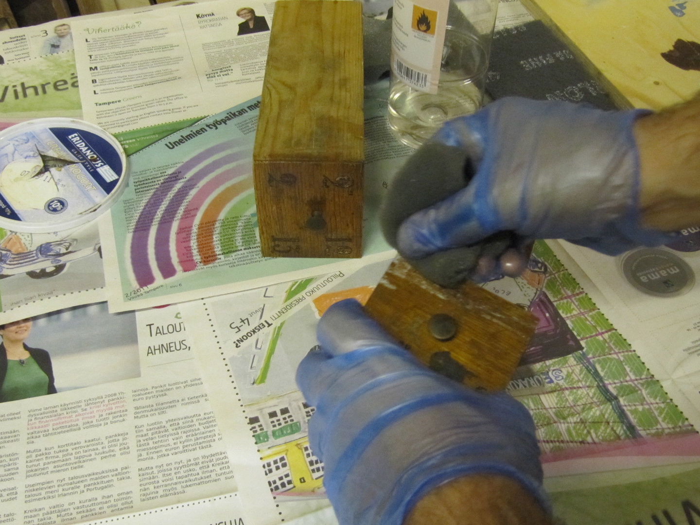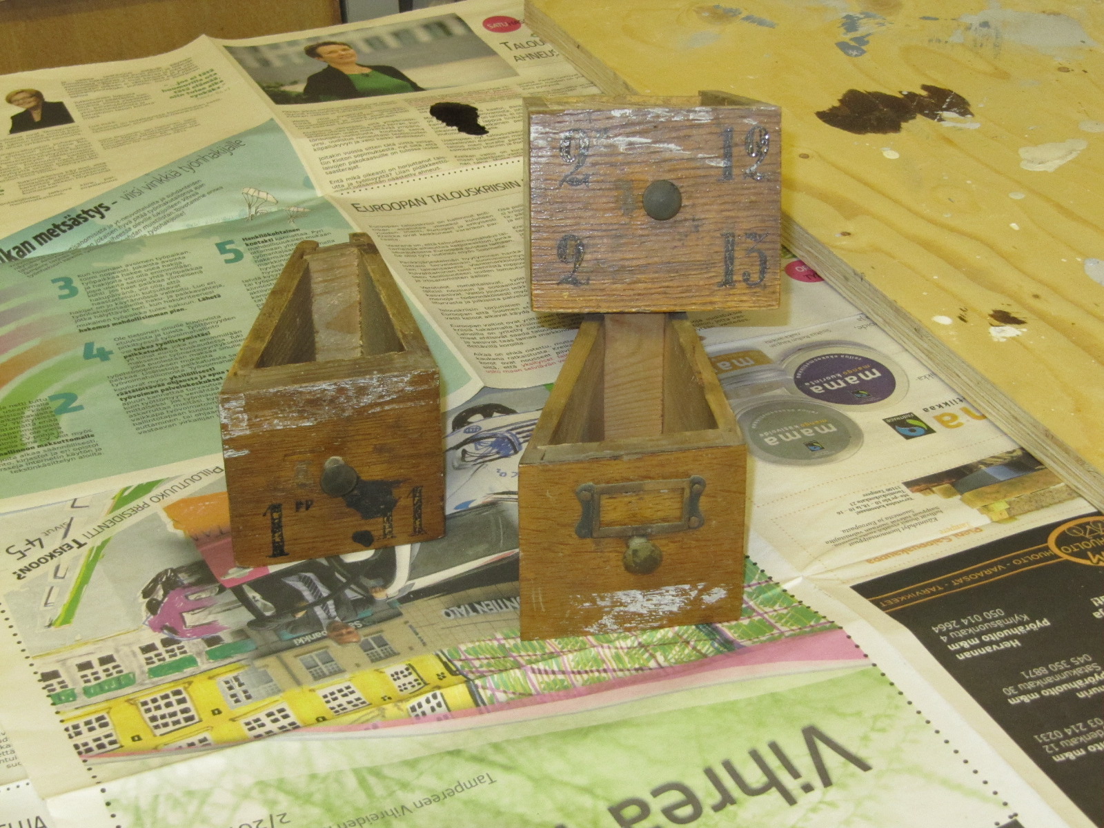 Projektin aloitin laatikoiden puhdistamisella liasta ja pakkausteipin liimasta. Puhdistukseen käytin Etasolia (etanolia) ja työn suoritin hyvin kevyesti. Tarkoituksenani oli poistaa vain lika, ja säilyttää ajan patina ja numerot laatikoissa.