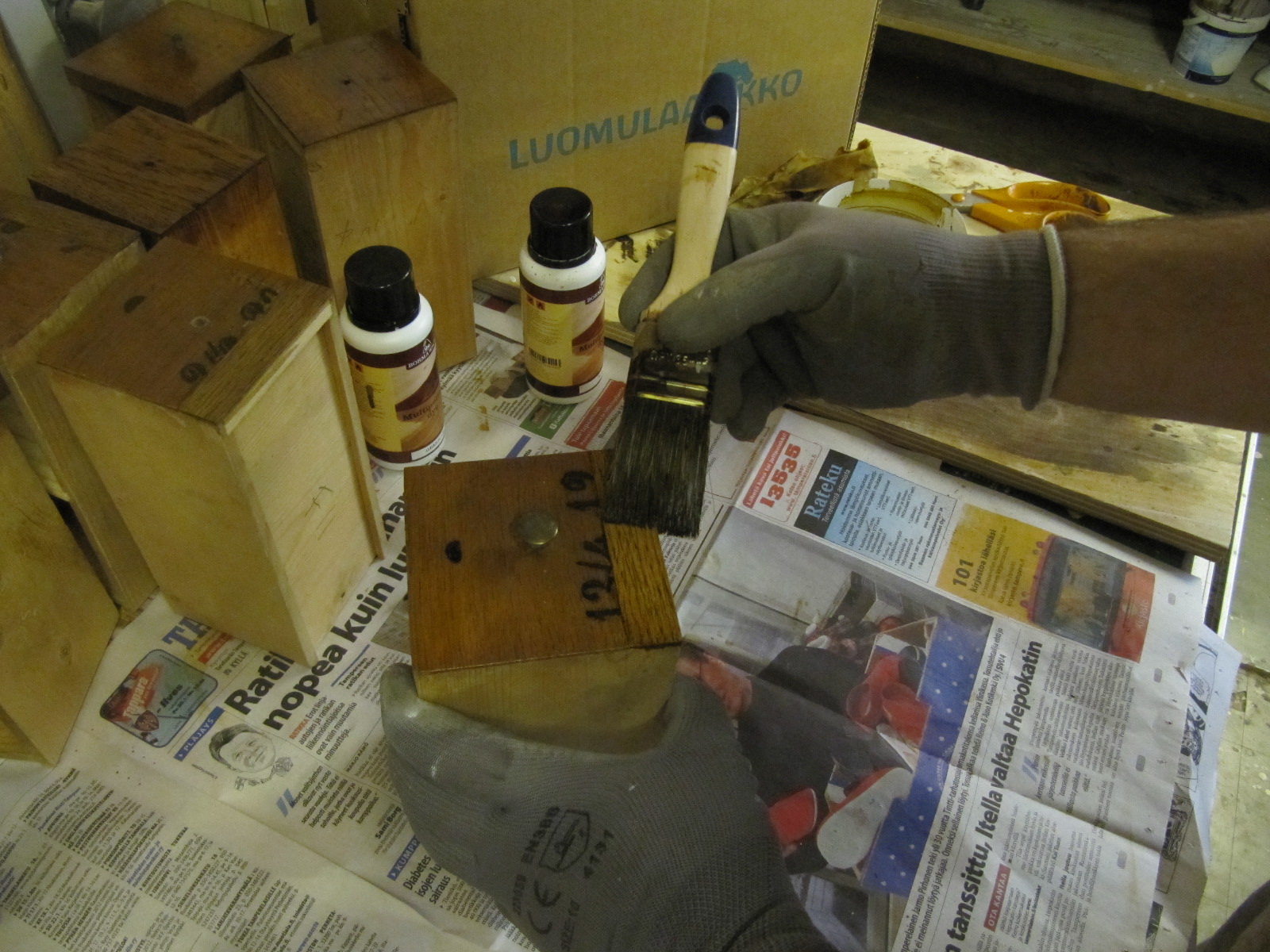 Korjatut ja uudet laatikot värjäsin petsitiivisteestä valmistamalla spriipetsillä (petsitiiviste+etasol).
