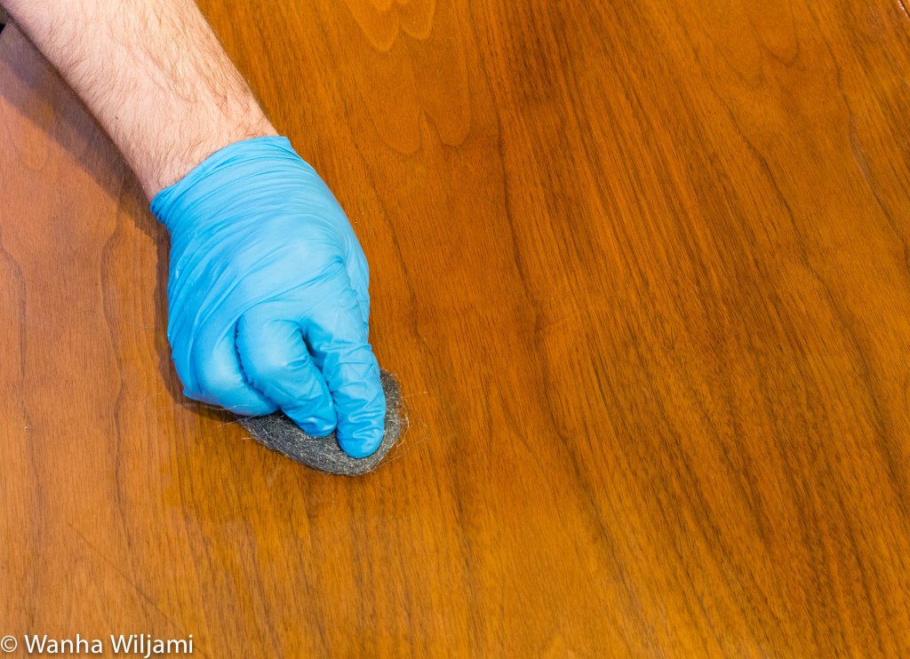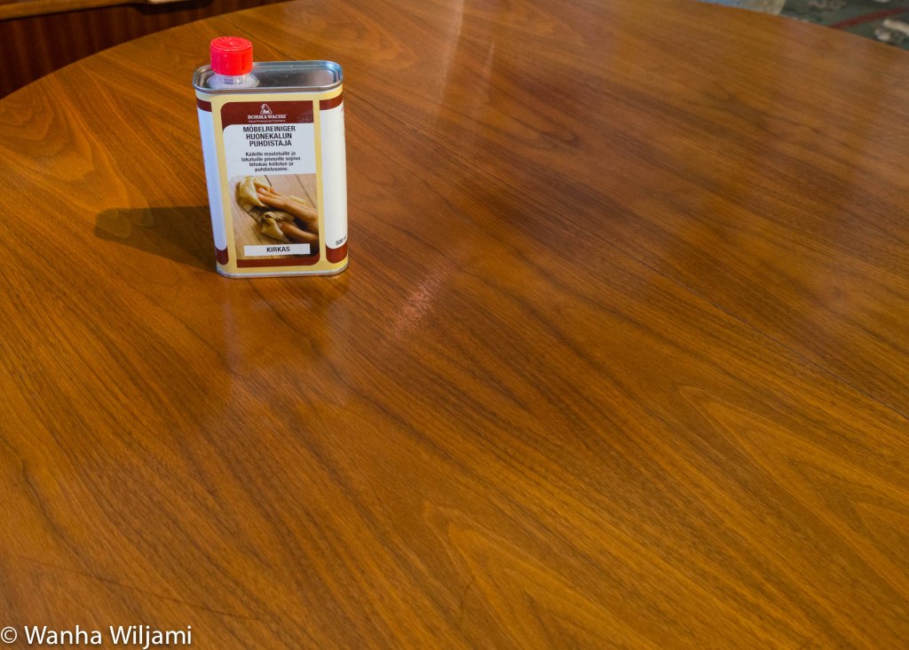 Kaadoin vaurion päälle vähän Huonekalunpuhdistajaa ja hankasin kohtaa teräsvillalla (000). Tämän jälkeen levitin koko pöydän pinnalle puhdistusainetta ja hankasin pintaa kevyesti neljän nollan teräsvillalla. Annoin puhdistusaineen vaikuttaa noin puoli tuntia, jonka jälkeen pyyhin pinnat puhtaalla kankaalla.