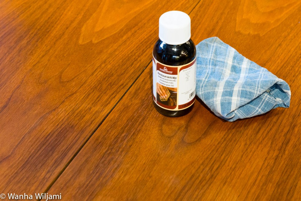 Halusin vielä suojata lakkapintaa Entisöintiöjyllä. Valitsin tumma puu-sävyn, koska tarkoitus oli saada pöydästä astetta tummempi. Levitin öljyn nukaamattomalla kankaalla ja pyyhin ylimääräisen öljyn pois.