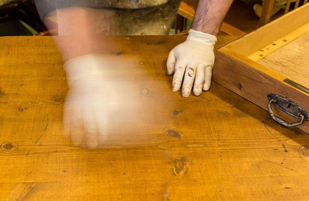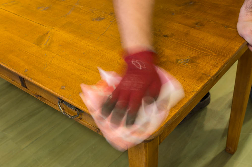 30 minuutin kuivumisajan jälkeen hankasin pinnasta ylimääräisen vahan pois teräsvillalla (0000). Tällä ehkäistään ettei pinnasta tule tahmea. Jos vahattu pinta jää tahmeaksi, niin siitä irtoaa väriä esineisiin.