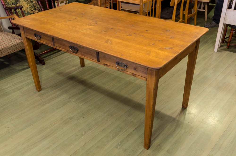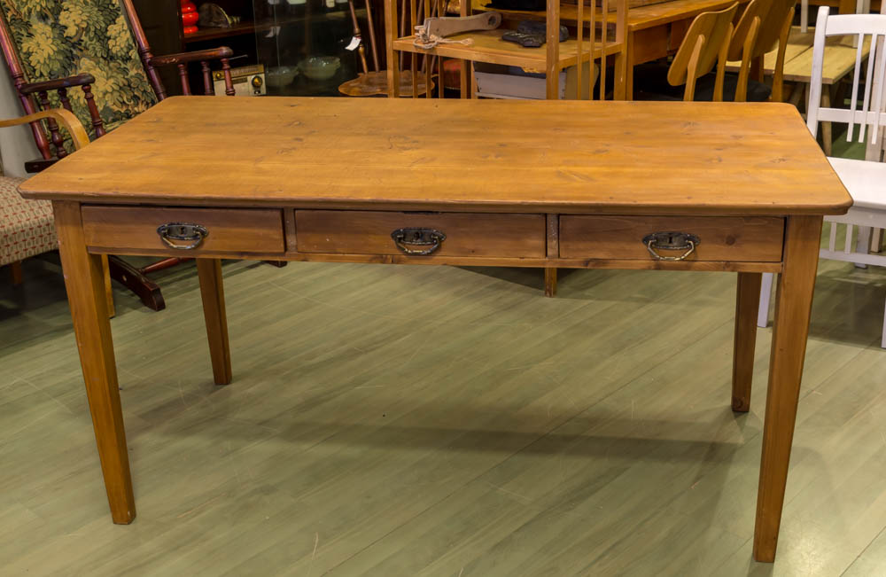 Ruskea talonpoikaispöytä on tehty 1900-luvun alussa. Pöytä on jossain vaiheessa kunnostettu, jolloin siitä on poistettu vanhat maalit ja jätetty puupinnalle, joka on sitten värjätty ruskeaksi. Pintakäsittely vaikutti olevan jonkin tyyppinen laseeraus ja vahaus. Pöydän ilme oli tunkkainen ja antoi jopa likaisen vaikutelman.