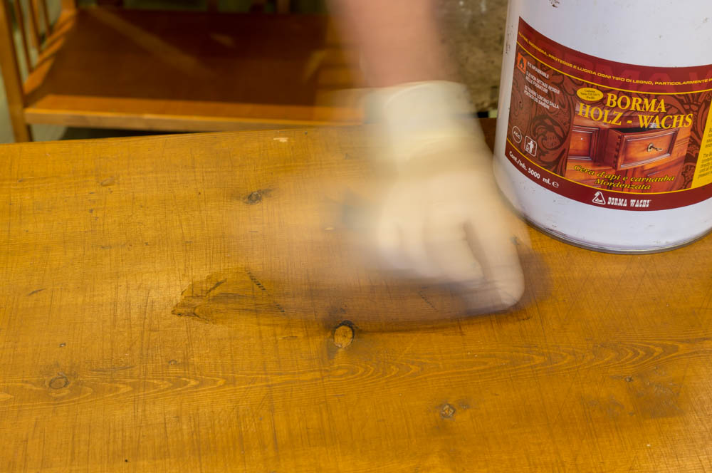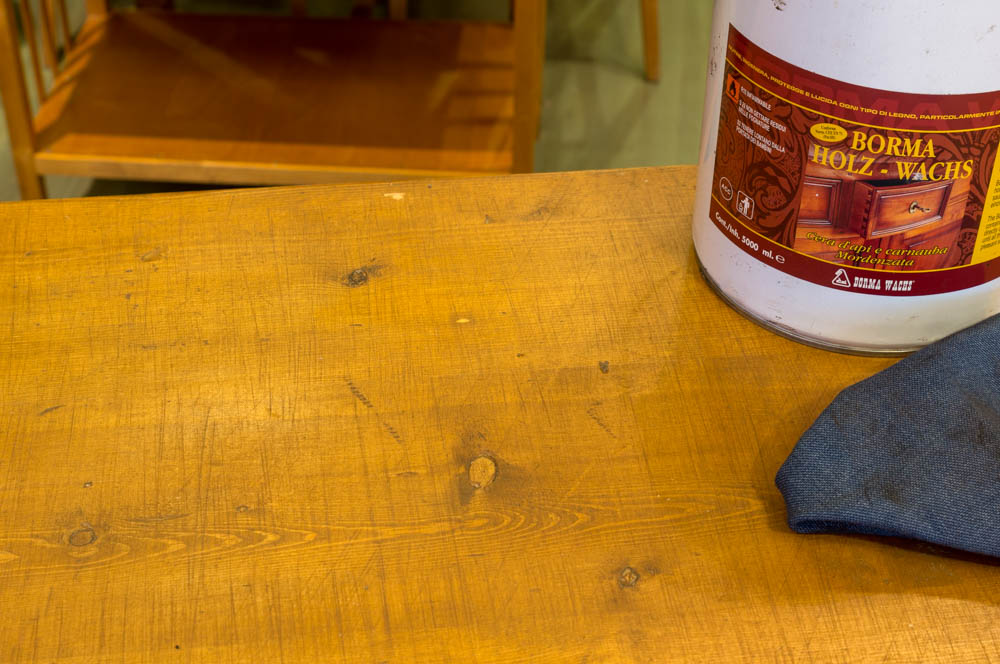 En kuitenkaan halunnut muuttaa pöydän pintakäsittelyä erilaiseksi, joten päätin vahata pinnan uudelleen ja antaa sille vain raikkaamman ehostuksen. Vahaksi valitsin Borma Wachsin valmistaman puuvahan ja tästä sävyn ”tumma pähkinä”. Sävy tasoittaisi hiukan pöydän värin epätasaisuutta, joka tuli esille vanhan vahan poiston jälkeen.