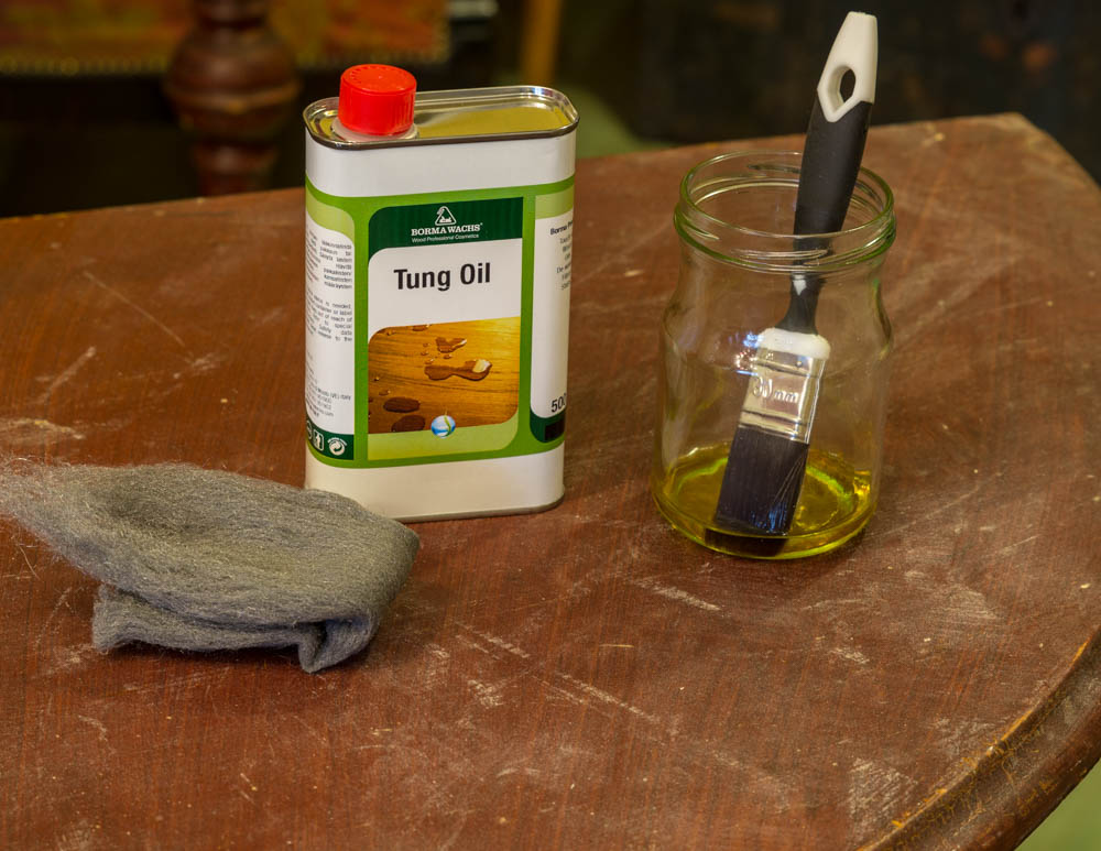 Annoin kiinanpuuöljyn imeytä pintaan noin 20 minuuttia, jonka jälkeen kävin pinnat kevyesti 0000 teräsvilla läpi. Tällä tavalla sain vaaleat jäljet pinnasta pois. Öljyn ollessa vielä märkä se ehkäisee pinnan vaurioitumista teräsvilla käsittelyssä. Käsiteltäessä vanhoja pintoja öljyllä ja teräsvillalla on muistettava tehdä koe johonkin huomaamattomaan paikkaan. Jokainen vanha pinta on yksilöllinen, käsittely voi olla joillekin pinnoille jopa vahingoksi, esim. maali saattaa lähteä pois.