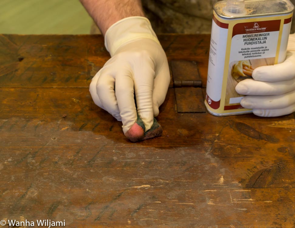 Pintojen puhdistamiseen päätin käyttää Borma Wachsin valmistamaa Huonekalun puhdistajaa. Oman kokemukseni mukaan tämä tuote poistaa hyvin likaa pinnoilta. Hyvin harvoin on tullut vastaan tilannetta jossa se vaurioittasi maalipintaa. Tällainen tapaus oli vuosia sitten. Kaappi jota silloin kunnostin oli maalattu maalilla, jonka sideaine oli heikko ja maali rupesi lähtemään pois. Tästä syystä on aina hyvä tehdä koe, johonkin huomaamatomaan kohtaan. Muuten sattaa tulla ikäviä yllätyksiä.