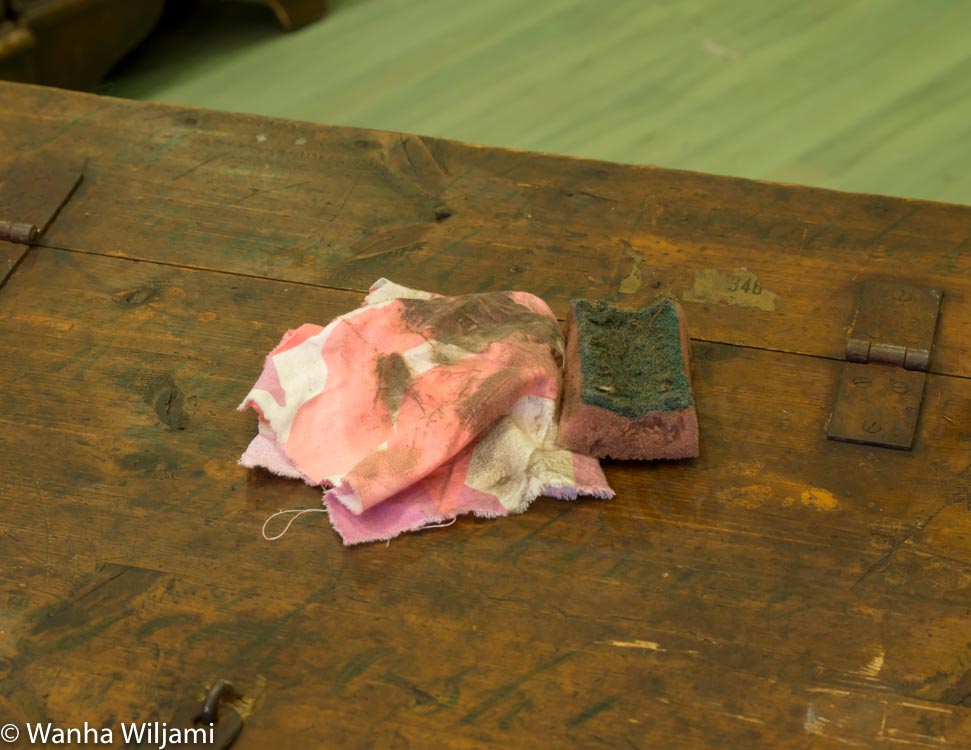 Ironneen lian pyyhin pois vanhalla kankaalla. Tähän tarkoitukseen sopii hyvin kotitaloudesta poistuneen kankaat. Kankaan on hyvä kuitenkin olla sellaista josta ei lähde nukkaa. Itselläni oli käytössä pala vanhaa pussilakanaa.