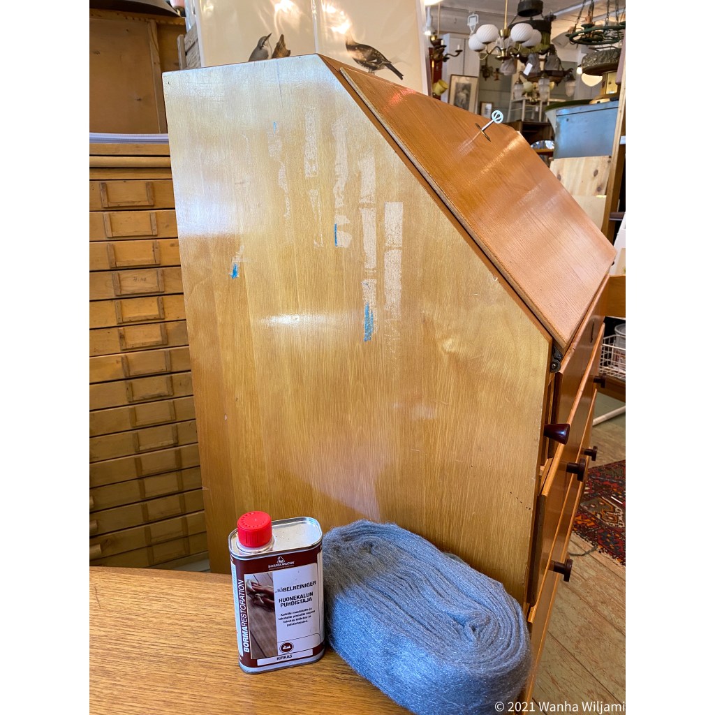 1950-luvun kalusteet tuovat mukanaan kauniita linjoja ja nostalgista tunnelmaa, mutta samalla ne vaativat hoitoa ja huolenpitoa. Lakkapintaisten kalusteiden, kuten vanhojen kirjoituslipastojen, pinnan käsittely voi olla haastavaa erityisesti silloin, kun pinnalle on jossain vaiheessa kiinnitetty teippiä. Teippi saattaa jättää jälkeensä liimatahroja tai vaurioittaa lakattua pintaa, ja jälkien poistaminen ilman vahinkoa vaatii harkittuja otteita. Tässä yksi tapa jonka avulla pääsin eroon teipin paloista ja liima jäljistä lakkapintaa vahingoittamatta.