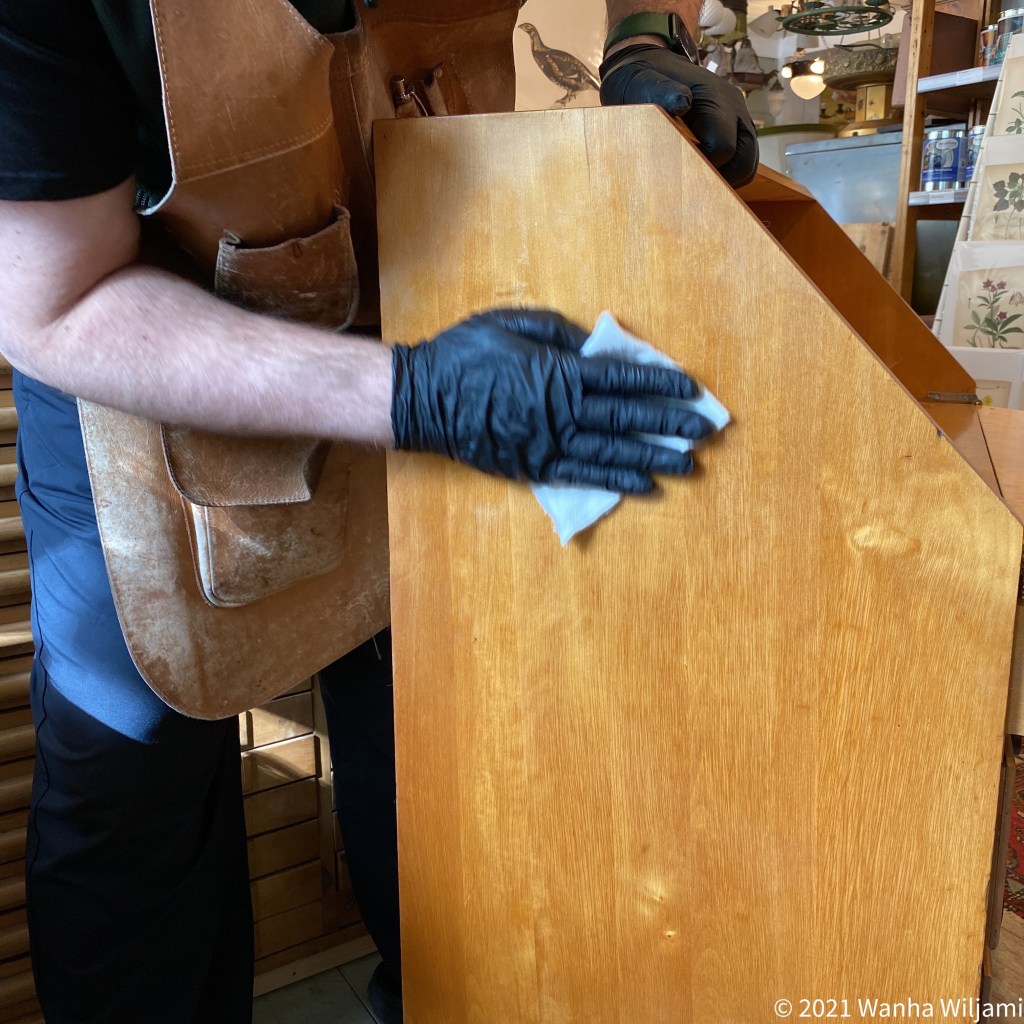 Hankaamisen jälkeen puhdistin käsitellyn alueen pehmeällä, puhtaalla liinalla. Tämä vaihe oli tärkeä, sillä se auttoi poistamaan niin liiman kuin puhdistusaineenkin jäänteet, varmistaen samalla, että pinta jäi tasaiseksi ja puhtaaksi. Pehmeä liina ei naarmuttanut lakkapintaa, ja sen avulla pystyin varmistamaan, että lopputulos oli siisti ja kaunis. Tämän jälkeen lipastoni oli valmis seuraavaan käsittelyvaiheeseen.