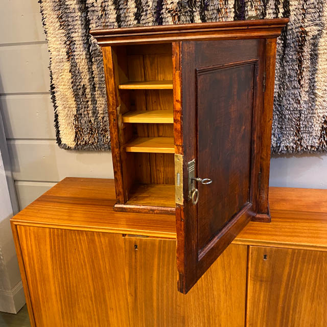 Päätin myös vaihtaa kaapin oven lukon, jotta ovi pysyisi kunnolla kiinni. Kaapin sisäosat ja taustan käsittelin värittömällä sellakkapohjusteella, sillä huomasin, että kaapissa oli hieman savun hajua. Sellakkapohjuste auttoi raikastamaan sisäilmaa ja suojaamaan pintoja.
